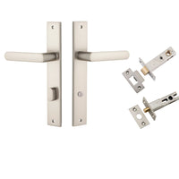 Included in Kit: Door Lever Osaka Rectangular Privacy Pair Satin Nickel CTC85mm H240xW38xP55mm Inbuilt Privacy Kit, Tube Latch Split Cam 'T' Striker Satin Nickel Backset 60mm, Privacy Bolt Round Bolt Satin Nickel Backset 60mm