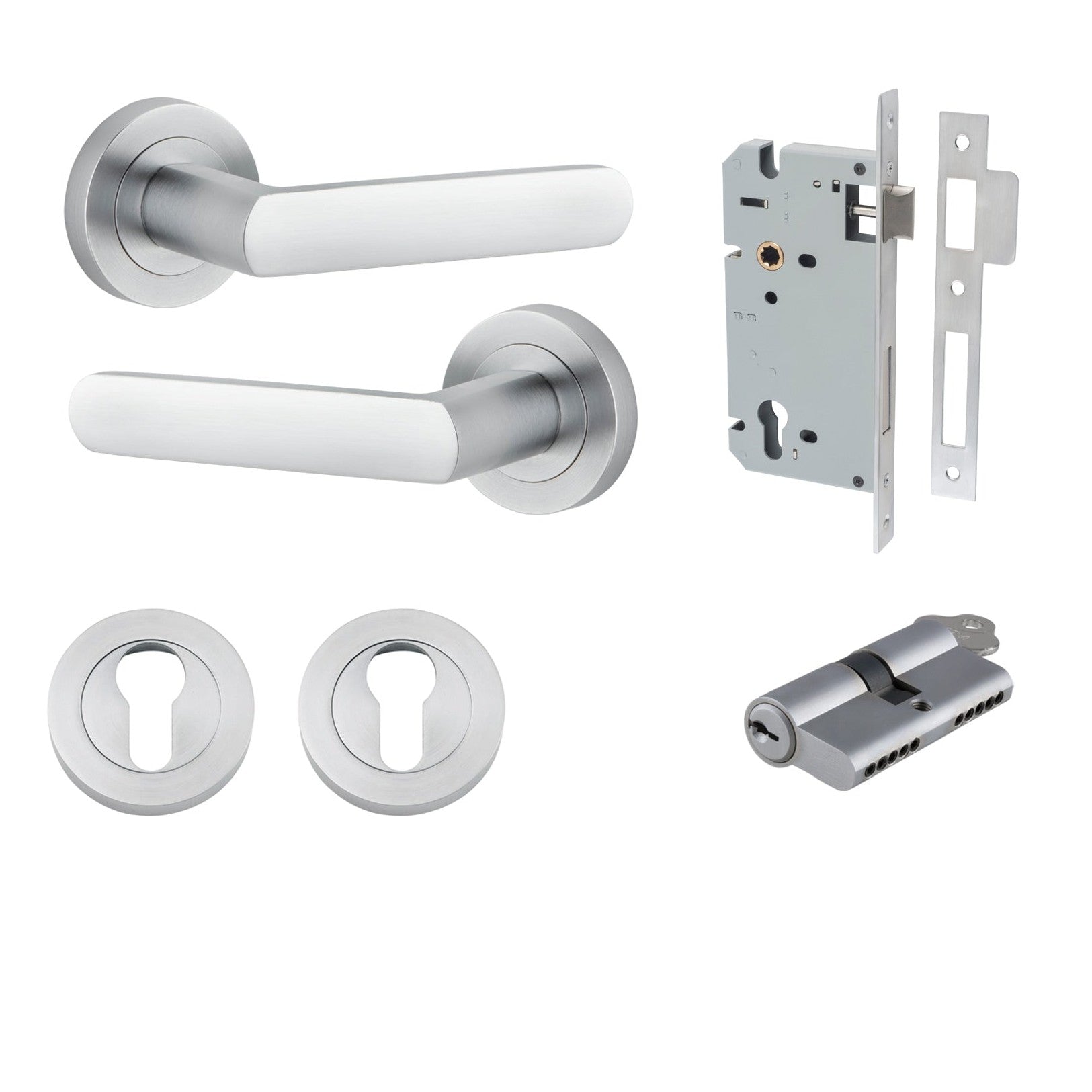 Included in Kit: Door Lever Osaka Round Rose Brushed Chrome D52xP55mm Entrance Kit, Mortice Lock Euro Brushed Chrome CTC85mm Backset 60mm, Euro Cylinder Dual Function 5 Pin Brushed Chrome L65mm KA1, Escutcheon Euro Concealed Fix Round Pair Brushed Chrome D52xP10mm