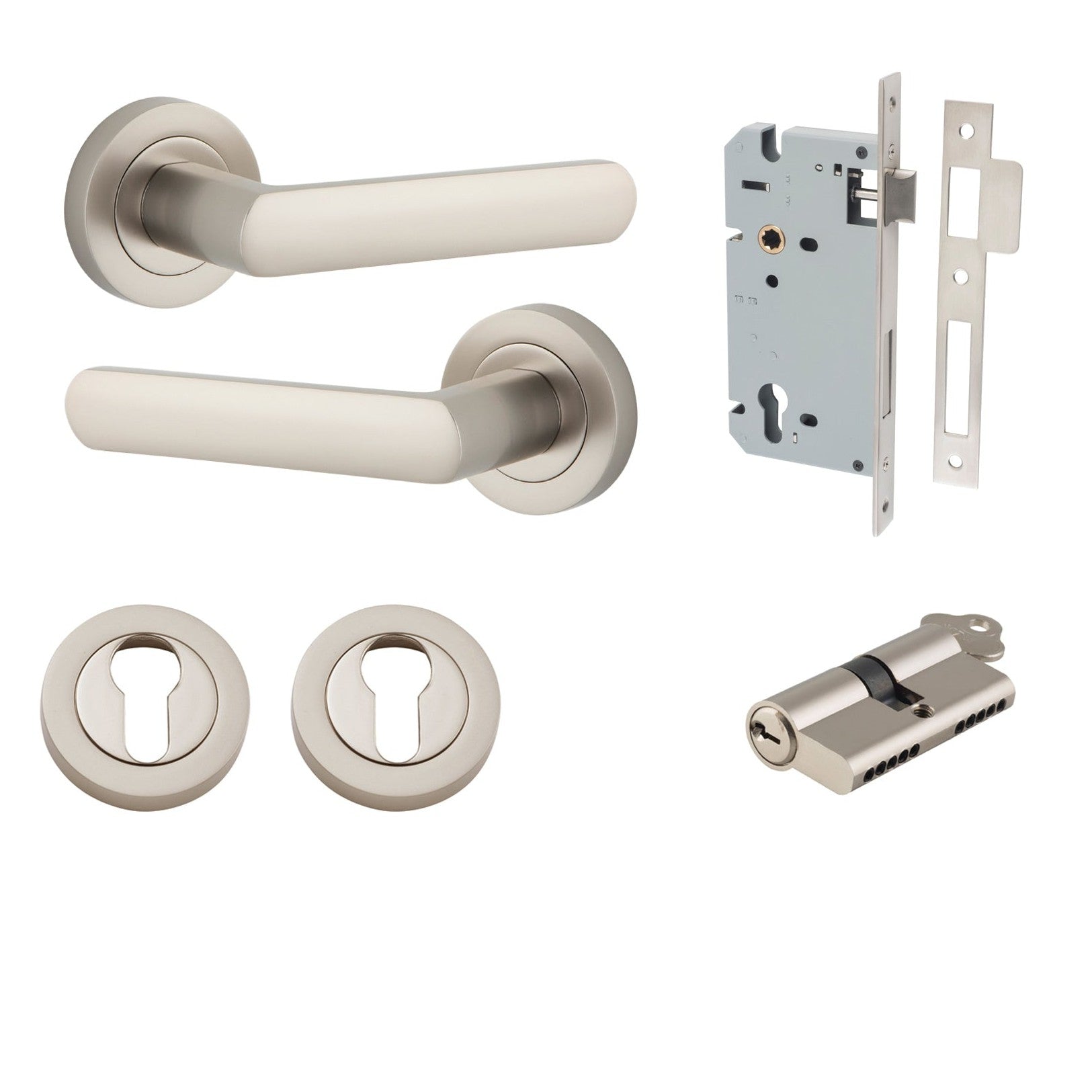Included in Kit: Door Lever Osaka Round Rose Satin Nickel D52xP55mm Entrance Kit, Mortice Lock Euro Satin Nickel CTC85mm Backset 60mm, Euro Cylinder Dual Function 5 Pin Satin Nickel L65mm KA1, Escutcheon Euro Concealed Fix Round Pair Satin Nickel D52xP10mm