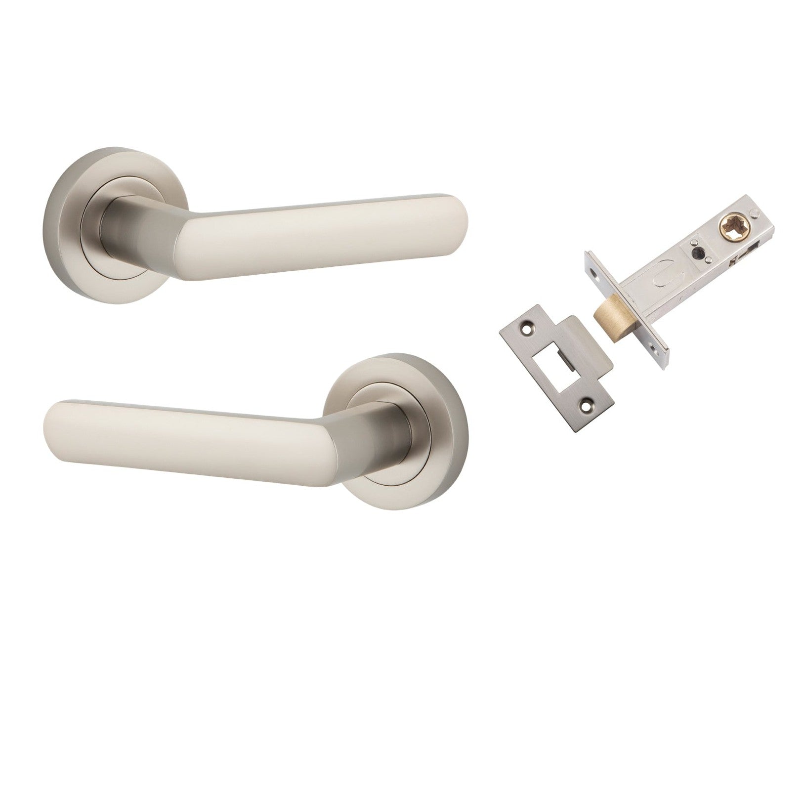 Included in Kit: Door Lever Osaka Round Rose Satin Nickel D52xP55mm Passage Kit, Tube Latch Split Cam 'T' Striker Satin Nickel Backset 60mm