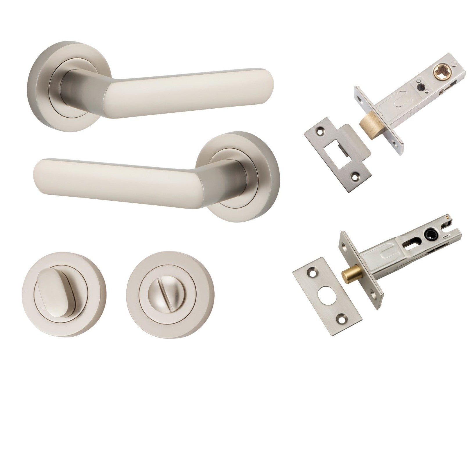 Included in Kit: Door Lever Osaka Round Rose Satin Nickel D52xP55mm Privacy Kit, Tube Latch Split Cam 'T' Striker Satin Nickel Backset 60mm, Privacy Bolt Round Bolt Satin Nickel Backset 60mm, Privacy Turn Oval Concealed Fix Round Satin Nickel D52xP23mm