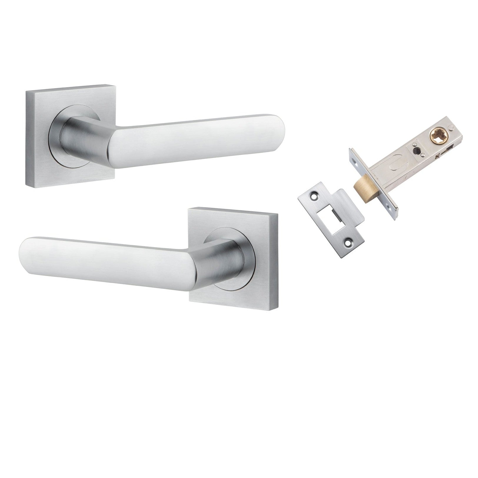 Included in Kit: Door Lever Osaka Square Rose Brushed Chrome H52xW52xP55mm Passage Kit, Tube Latch Split Cam 'T' Striker Brushed Chrome Backset 60mm