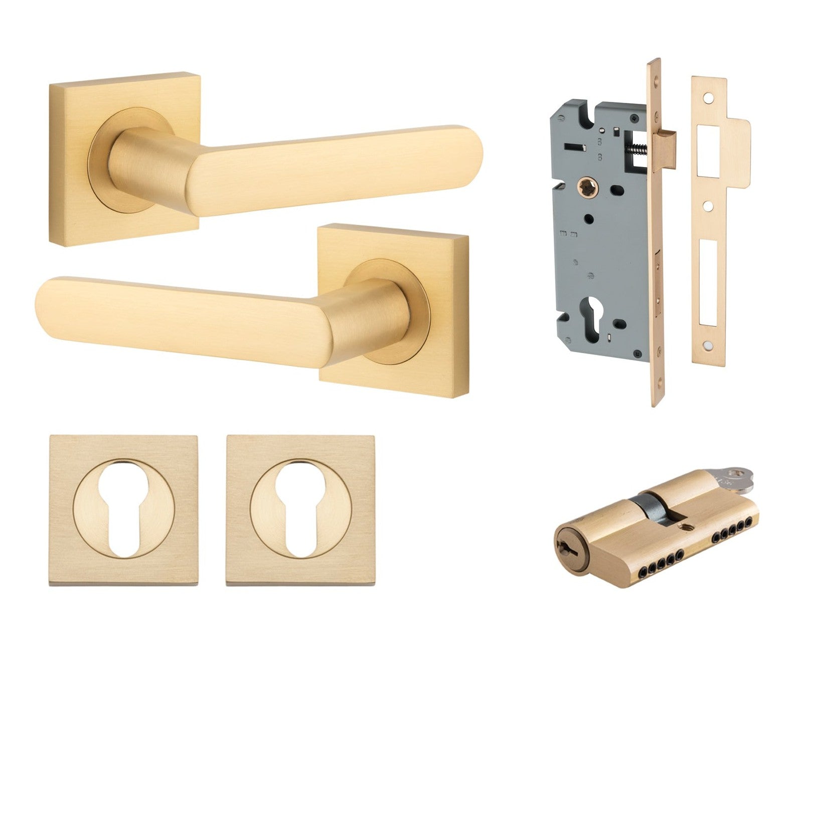 Included in Kit: Door Lever Osaka Square Rose Brushed Brass H52xW52xP55mm Entrance Kit, Mortice Lock Euro Brushed Brass CTC85mm Backset 60mm, Euro Cylinder Dual Function 5 Pin Brushed Brass L65mm KA1, Escutcheon Euro Concealed Fix Square Pair Brushed Brass H52xW52xP10mm