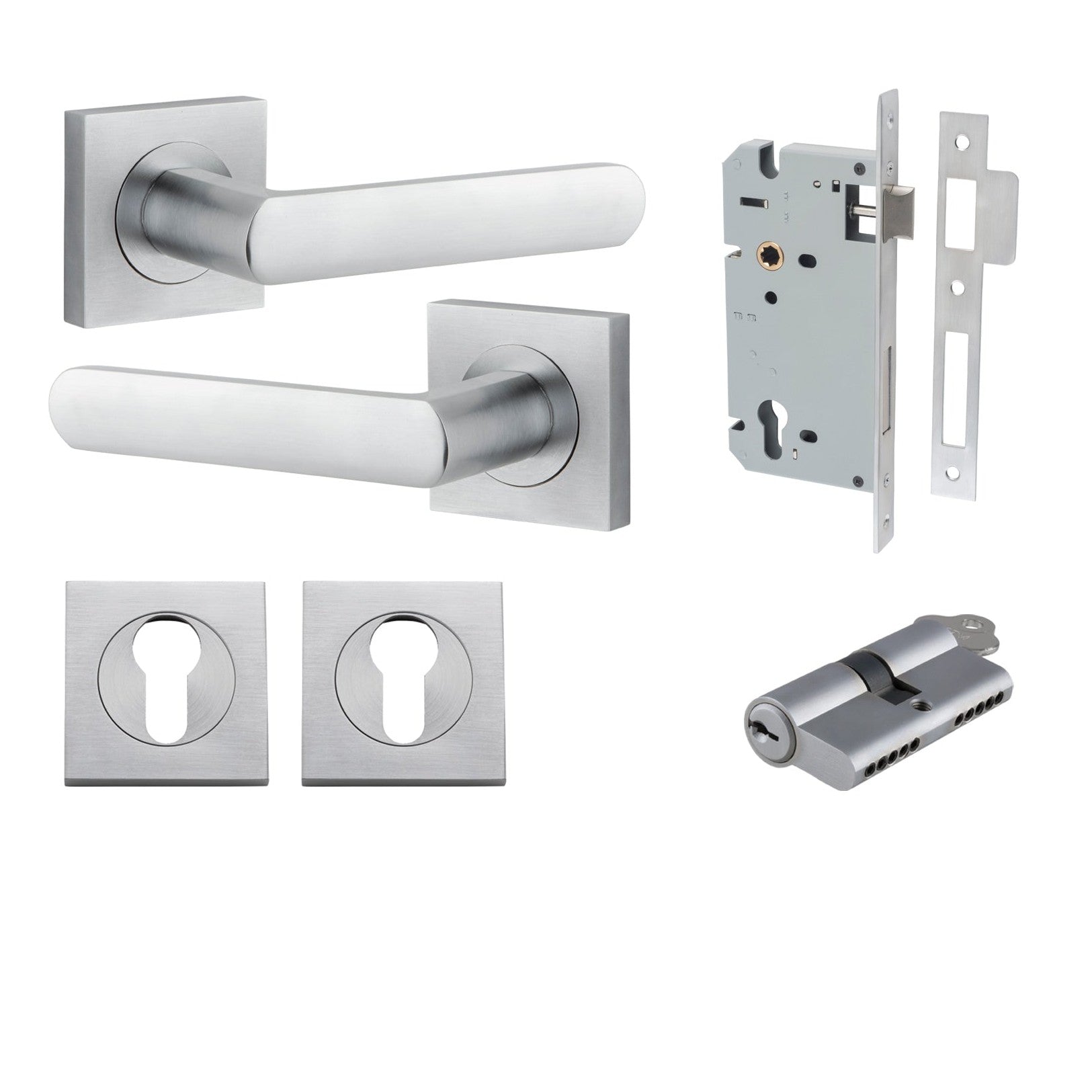Included in Kit: Door Lever Osaka Square Rose Brushed Chrome H52xW52xP55mm Entrance Kit, Mortice Lock Euro Brushed Chrome CTC85mm Backset 60mm, Euro Cylinder Dual Function 5 Pin Brushed Chrome L65mm KA1, Escutcheon Euro Concealed Fix Square Pair Brushed Chrome H52xW52xP10mm
