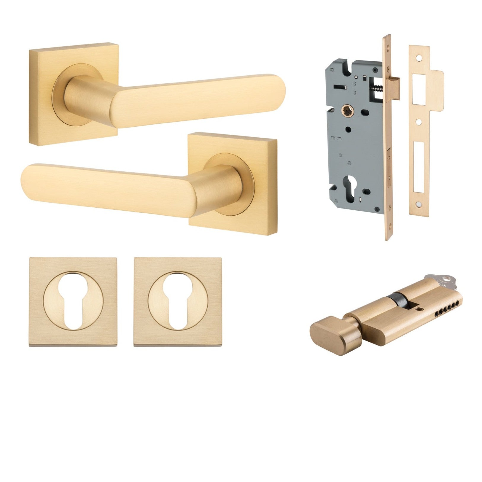 Included in Kit: Door Lever Osaka Square Rose Brushed Brass H52xW52xP55mm Entrance Kit, Mortice Lock Euro Brushed Brass CTC85mm Backset 60mm, Euro Cylinder Key Thumb 6 Pin Brushed Brass L70mm KA1, Escutcheon Euro Concealed Fix Square Pair Brushed Brass H52xW52xP10mm