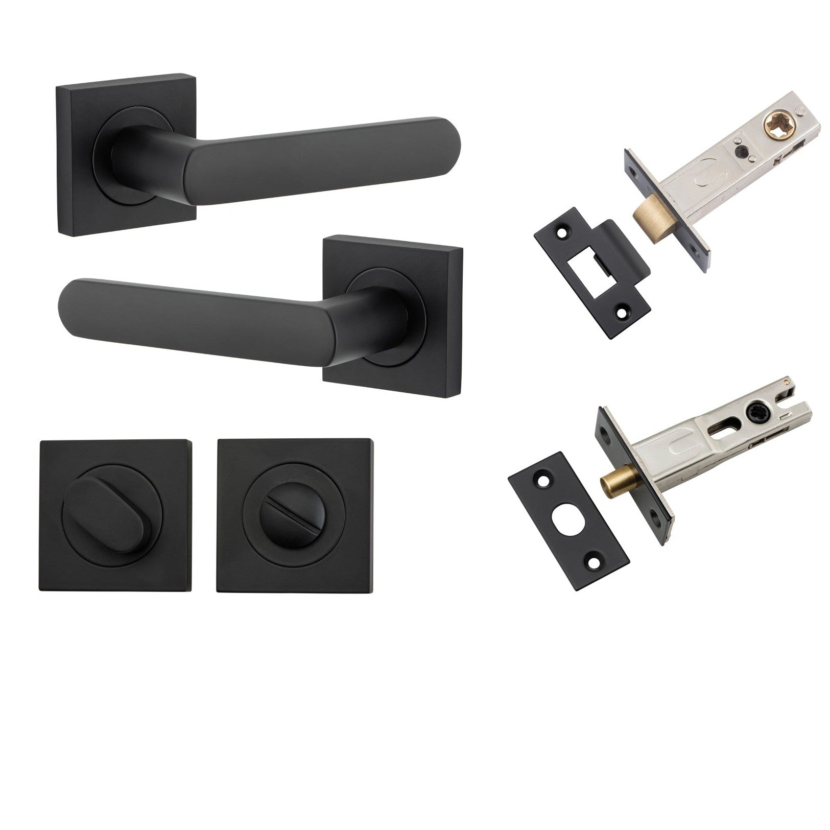 Included in Kit: Door Lever Osaka Square Rose Matt Black H52xW52xP55mm Privacy Kit, Tube Latch Split Cam 'T' Striker Matt Black Backset 60mm, Privacy Bolt Round Bolt Matt Black Backset 60mm, Privacy Turn Oval Concealed Fix Square Matt Black H52xW52xP23mm