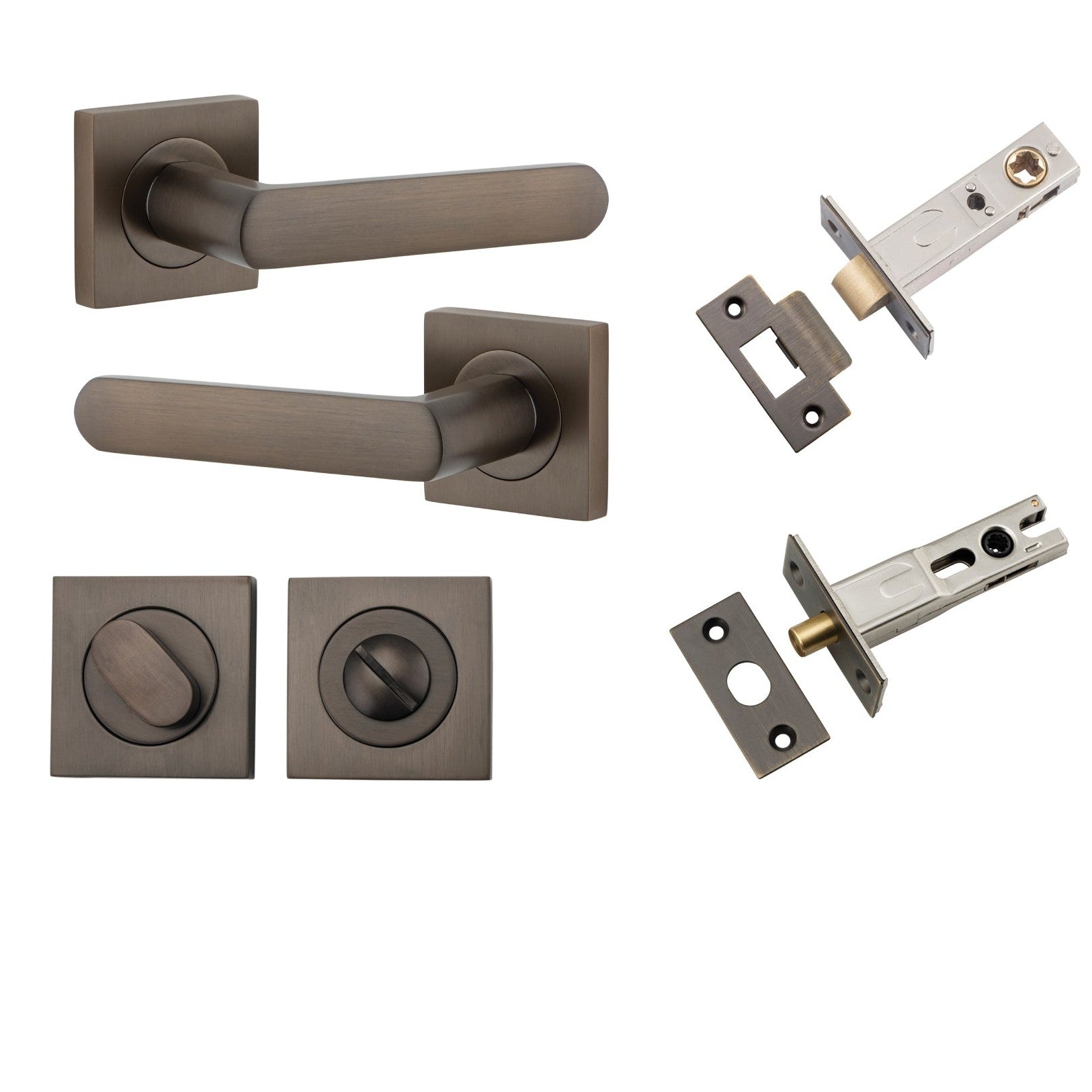 Included in Kit: Door Lever Osaka Square Rose Signature Brass H52xW52xP55mm Privacy Kit, Tube Latch Split Cam 'T' Striker Signature Brass Backset 60mm, Privacy Bolt Round Bolt Signature Brass Backset 60mm, Privacy Turn Oval Concealed Fix Square Signature Brass H52xW52xP23mm