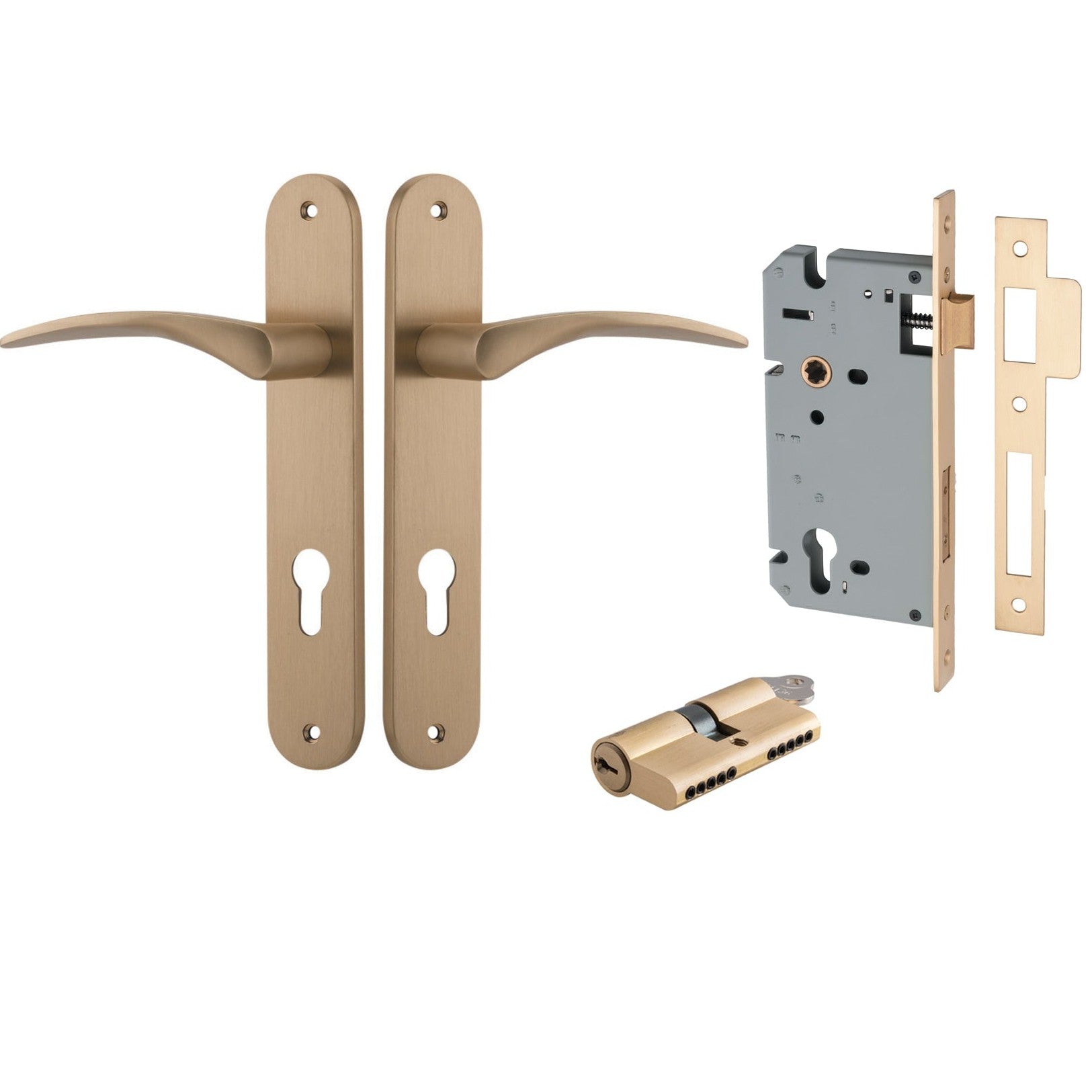 Included in Kit: Door Lever Oxford Oval Euro Brushed Brass CTC85mm H237xW40xP60mm Entrance Kit, Mortice Lock Euro Brushed Brass CTC85mm Backset 60mm, Euro Cylinder Dual Function 5 Pin Brushed Brass L65mm KA1