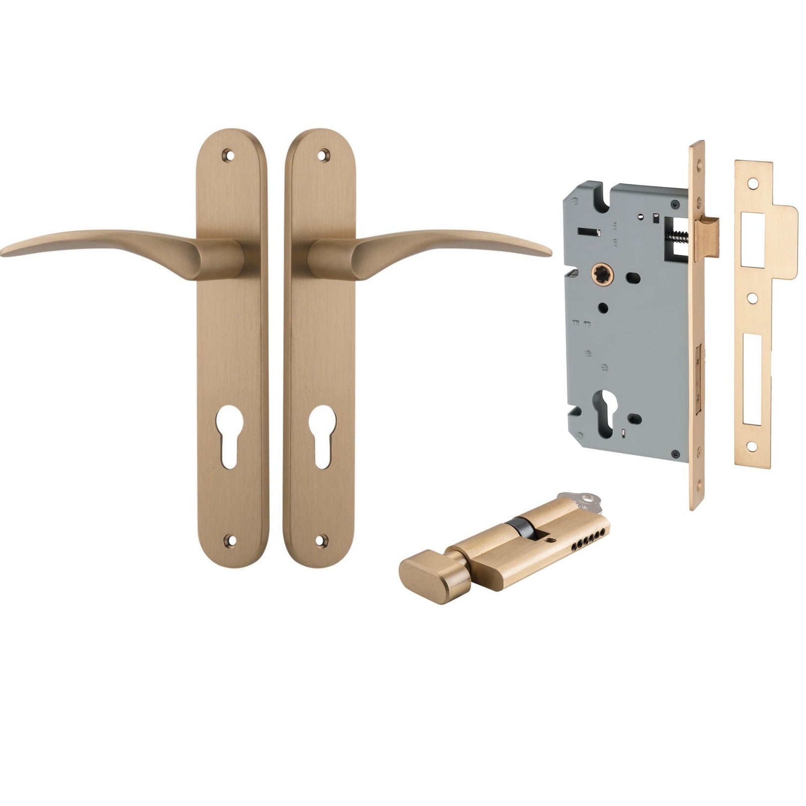 Included in Kit: Door Lever Oxford Oval Euro Brushed Brass CTC85mm H237xW40xP60mm Entrance Kit, Mortice Lock Euro Brushed Brass CTC85mm Backset 60mm, Euro Cylinder Key Thumb 6 Pin Brushed Brass L70mm KA1