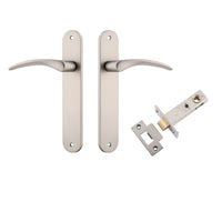 Included in Kit: Door Lever Oxford Oval Latch Satin Nickel H240xW40xP60mm Passage Kit, Tube Latch Split Cam 'T' Striker Satin Nickel Backset 60mm