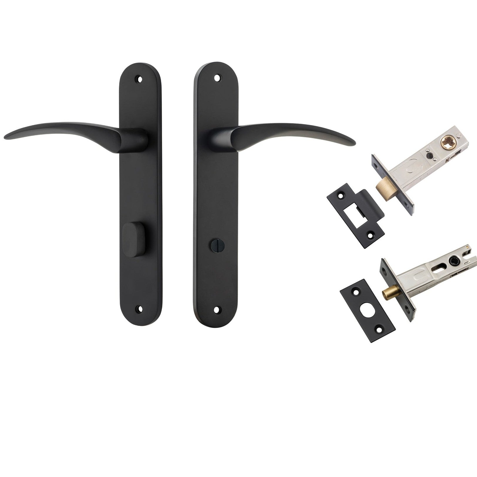 Included in Kit: Door Lever Oxford Oval Privacy Matt Black CTC85mm H240xW40xP60mm Inbuilt Privacy Kit, Tube Latch Split Cam 'T' Striker Matt Black Backset 60mm, Privacy Bolt Round Bolt Matt Black Backset 60mm