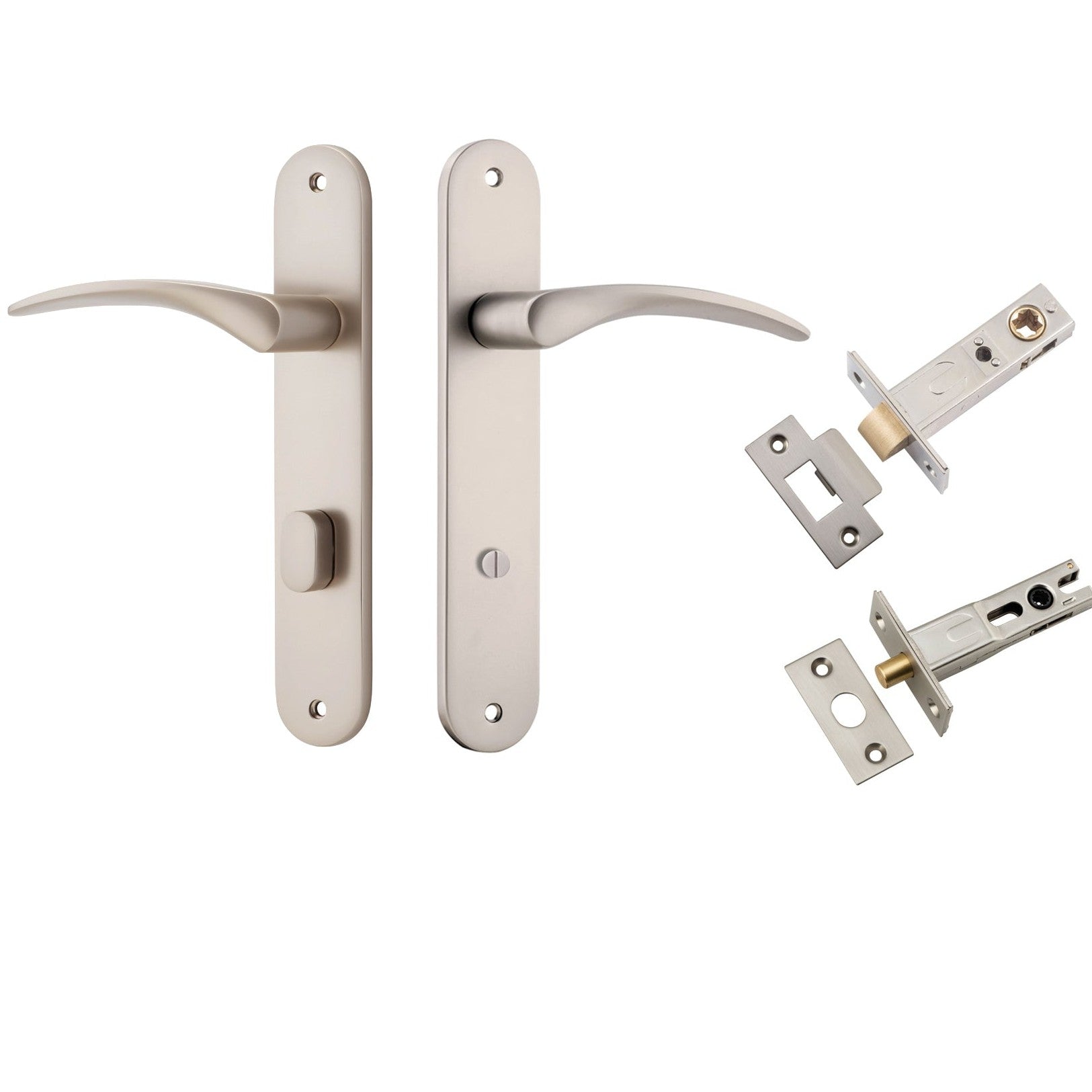 Included in Kit: Door Lever Oxford Oval Privacy Satin Nickel CTC85mm H240xW40xP60mm Inbuilt Privacy Kit, Tube Latch Split Cam 'T' Striker Satin Nickel Backset 60mm, Privacy Bolt Round Bolt Satin Nickel Backset 60mm