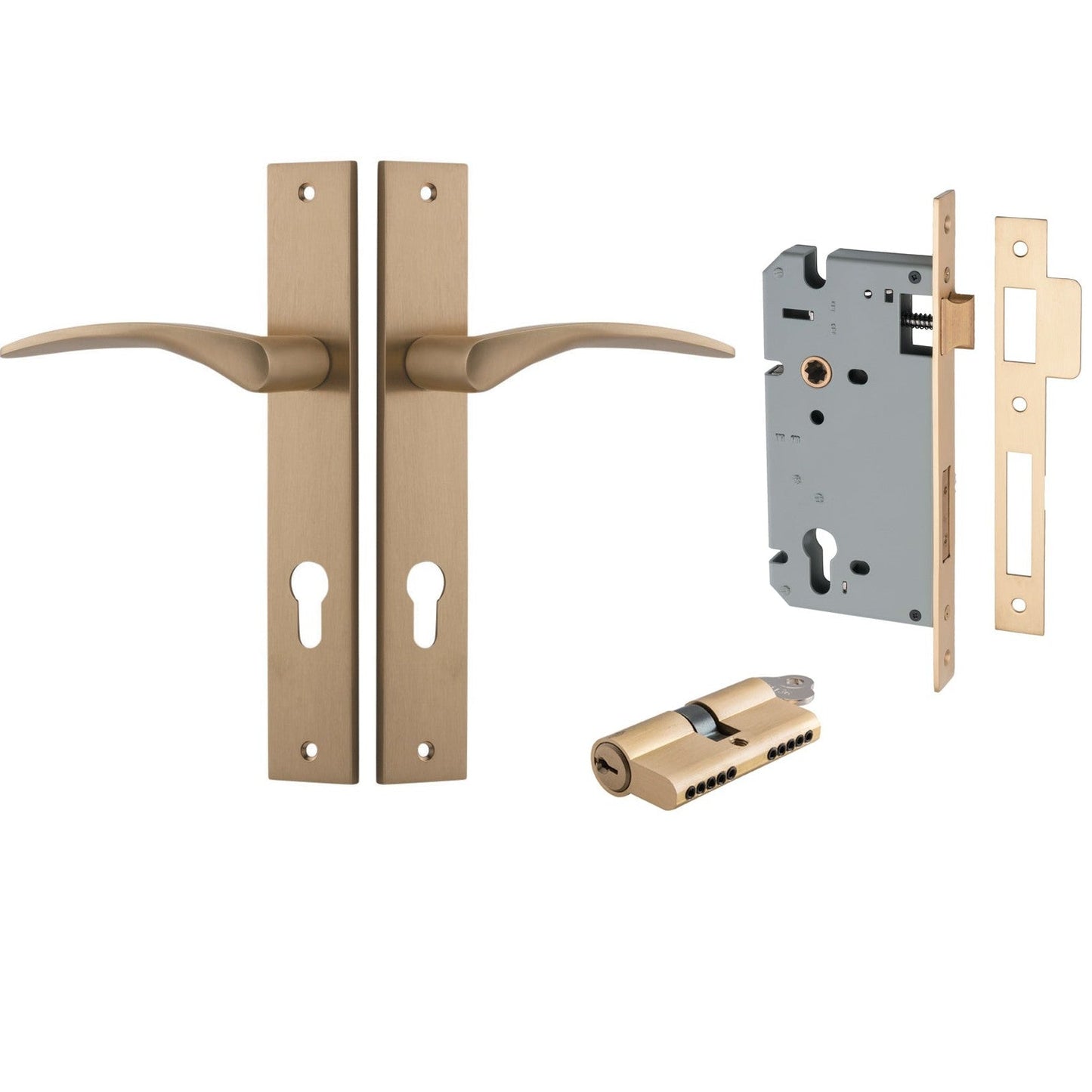 Included in Kit: Door Lever Oxford Rectangular Euro Brushed Brass CTC85mm H240xW38xP60mm Entrance Kit, Mortice Lock Euro Brushed Brass CTC85mm Backset 60mm, Euro Cylinder Dual Function 5 Pin Brushed Brass L65mm KA1