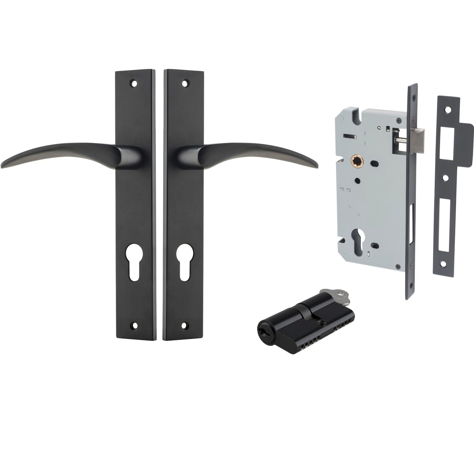 Included in Kit: Door Lever Oxford Rectangular Euro Matt Black CTC85mm H240xW38xP60mm Entrance Kit, Mortice Lock Euro Matt Black CTC85mm Backset 60mm, Euro Cylinder Dual Function 5 Pin Matt Black L65mm KA1