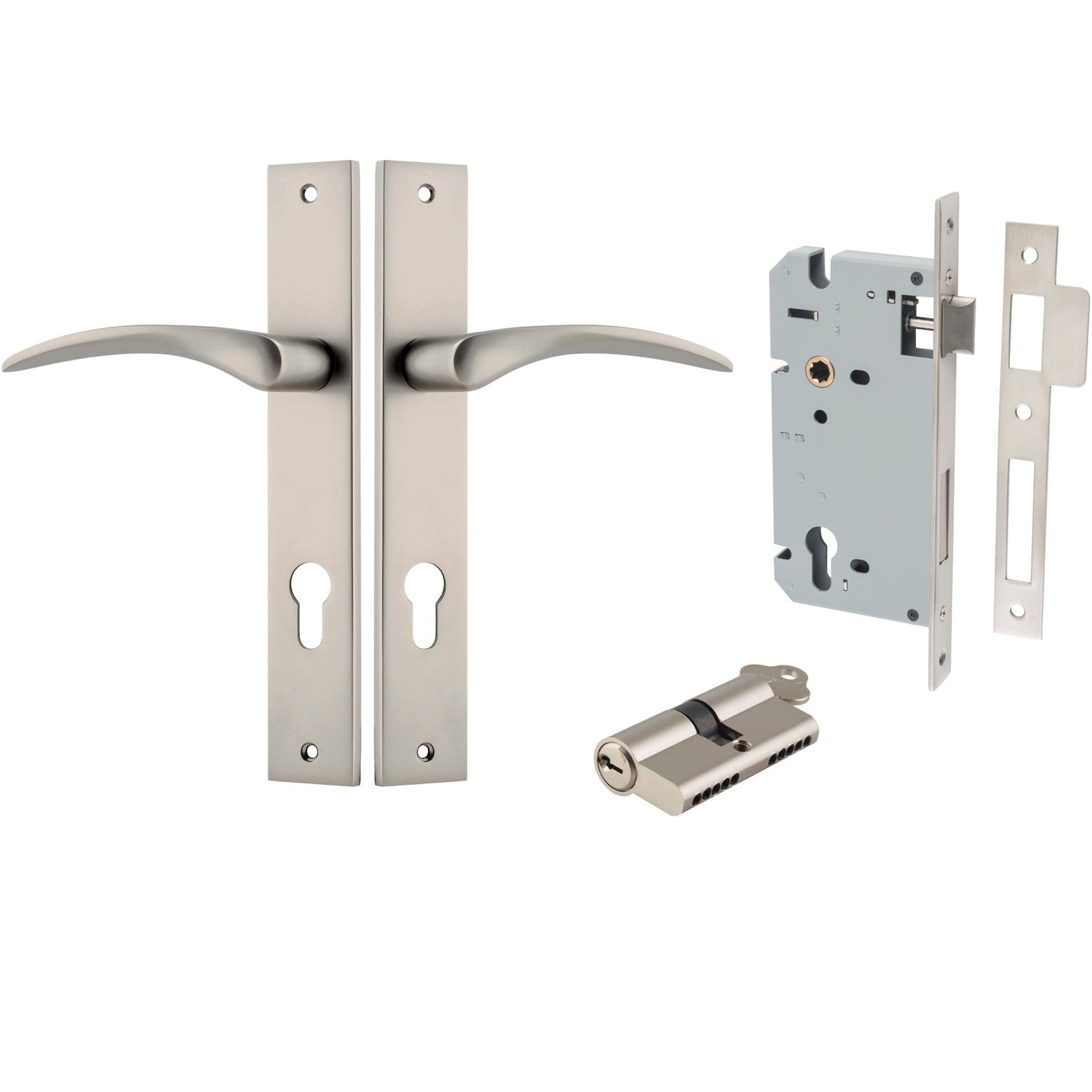 Included in Kit: Door Lever Oxford Rectangular Euro Satin Nickel CTC85mm H240xW38xP60mm Entrance Kit, Mortice Lock Euro Satin Nickel CTC85mm Backset 60mm, Euro Cylinder Dual Function 5 Pin Satin Nickel L65mm KA1