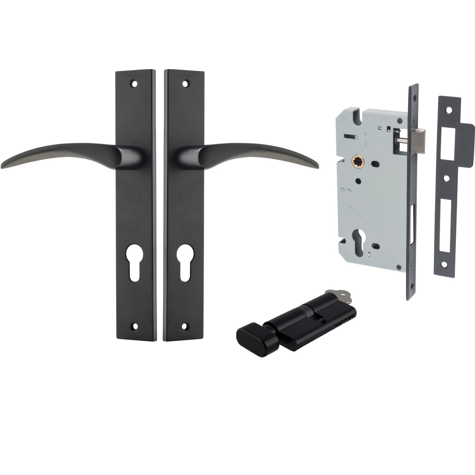 Included in Kit: Door Lever Oxford Rectangular Euro Matt Black CTC85mm H240xW38xP60mm Entrance Kit, Mortice Lock Euro Matt Black CTC85mm Backset 60mm, Euro Cylinder Key Thumb 6 Pin Matt Black L70mm KA1