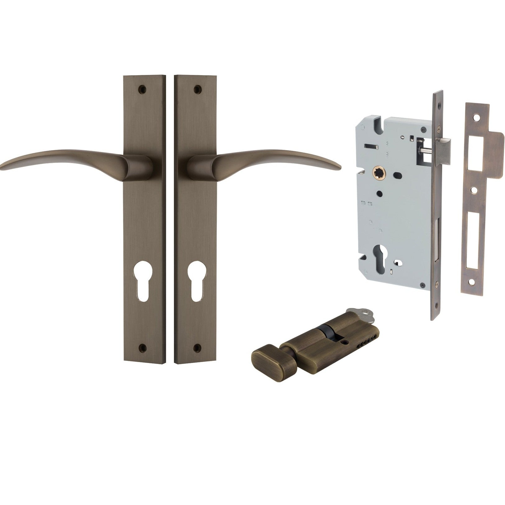 Included in Kit: Door Lever Oxford Rectangular Euro Signature Brass CTC85mm H240xW38xP60mm Entrance Kit, Mortice Lock Euro Signature Brass CTC85mm Backset 60mm, Euro Cylinder Key Thumb 6 Pin Signature Brass L70mm KA1