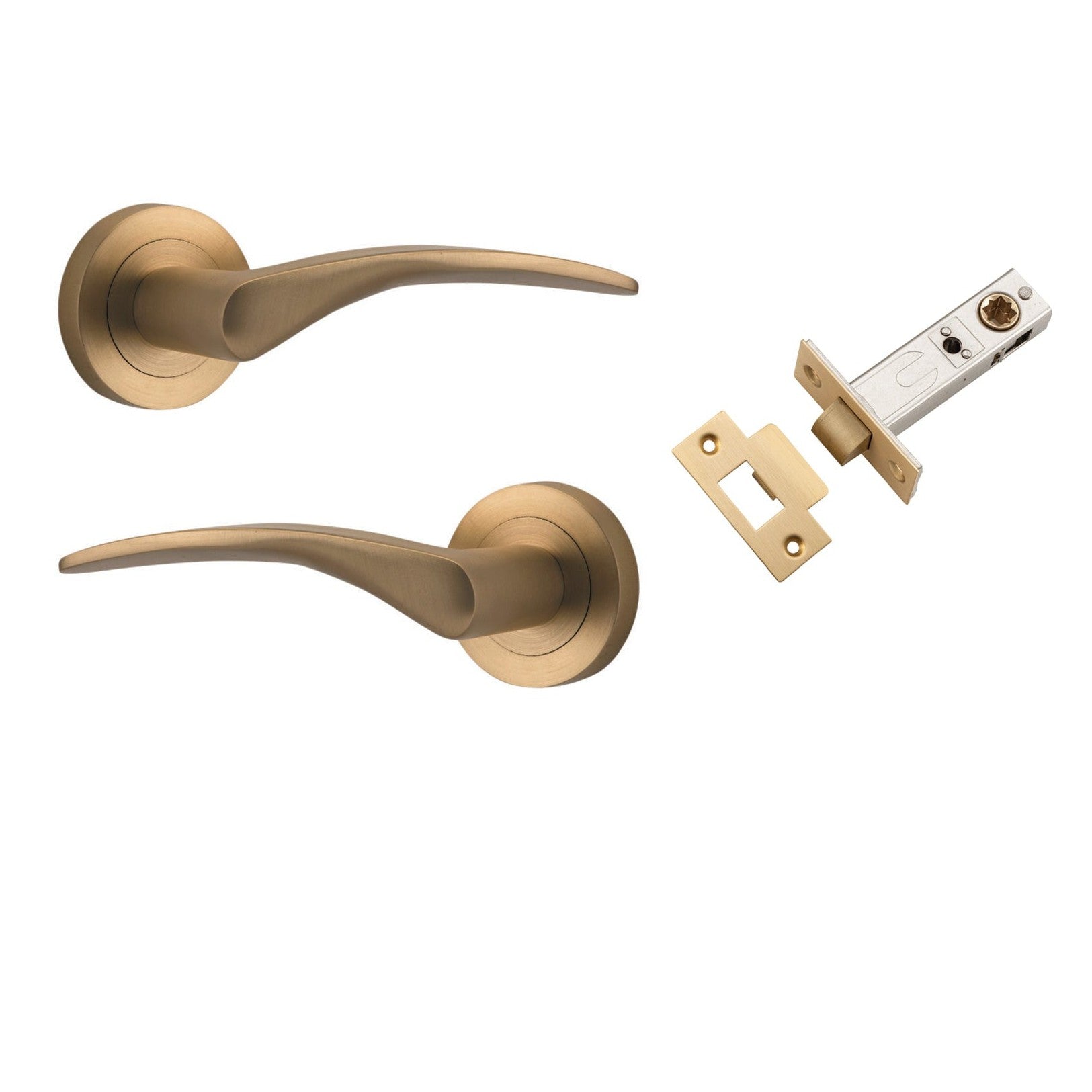 Included in Kit: Door Lever Oxford Round Rose Pair Brushed Brass D52xP64mm Passage Kit, Tube Latch Split Cam 'T' Striker Brushed Brass Backset 60mm