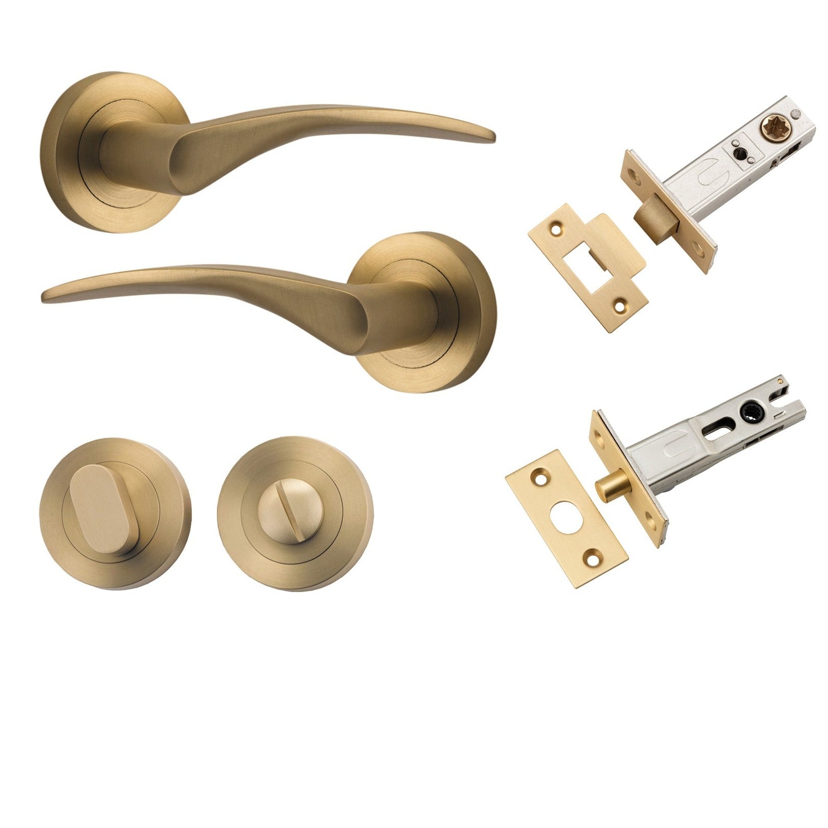 Included in Kit: Door Lever Oxford Round Rose Pair Brushed Brass D52xP64mm Privacy Kit, Tube Latch Split Cam 'T' Striker Brushed Brass Backset 60mm, Privacy Bolt Round Bolt Brushed Brass Backset 60mm, Privacy Turn Oval Concealed Fix Round Brushed Brass D52xP23mm