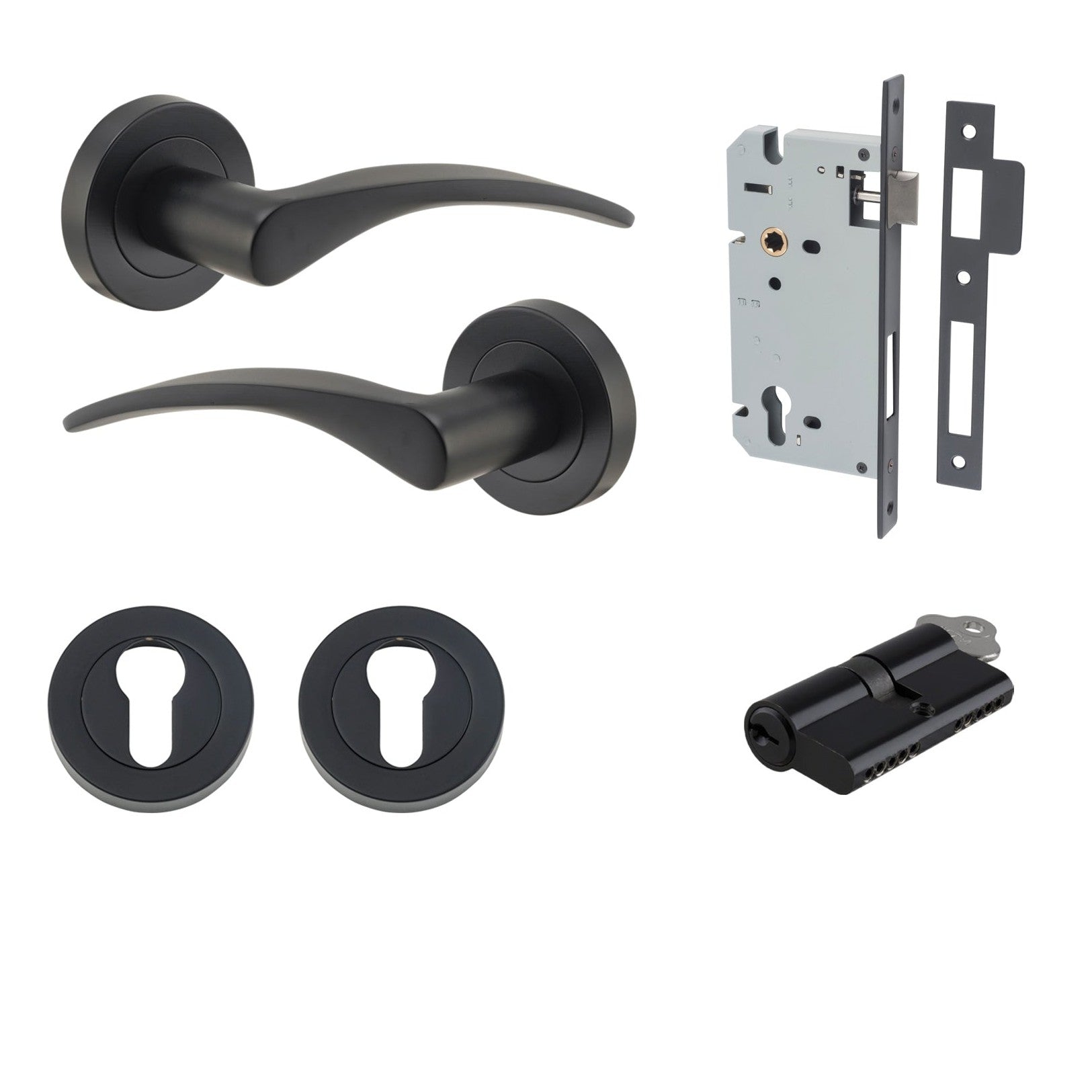 Included in Kit: Door Lever Oxford Round Rose Pair Matt Black D52xP64mm Entrance Kit, Mortice Lock Euro Matt Black CTC85mm Backset 60mm, Euro Cylinder Dual Function 5 Pin Matt Black L65mm KA1, Escutcheon Euro Concealed Fix Round Pair Matt Black D52xP10mm