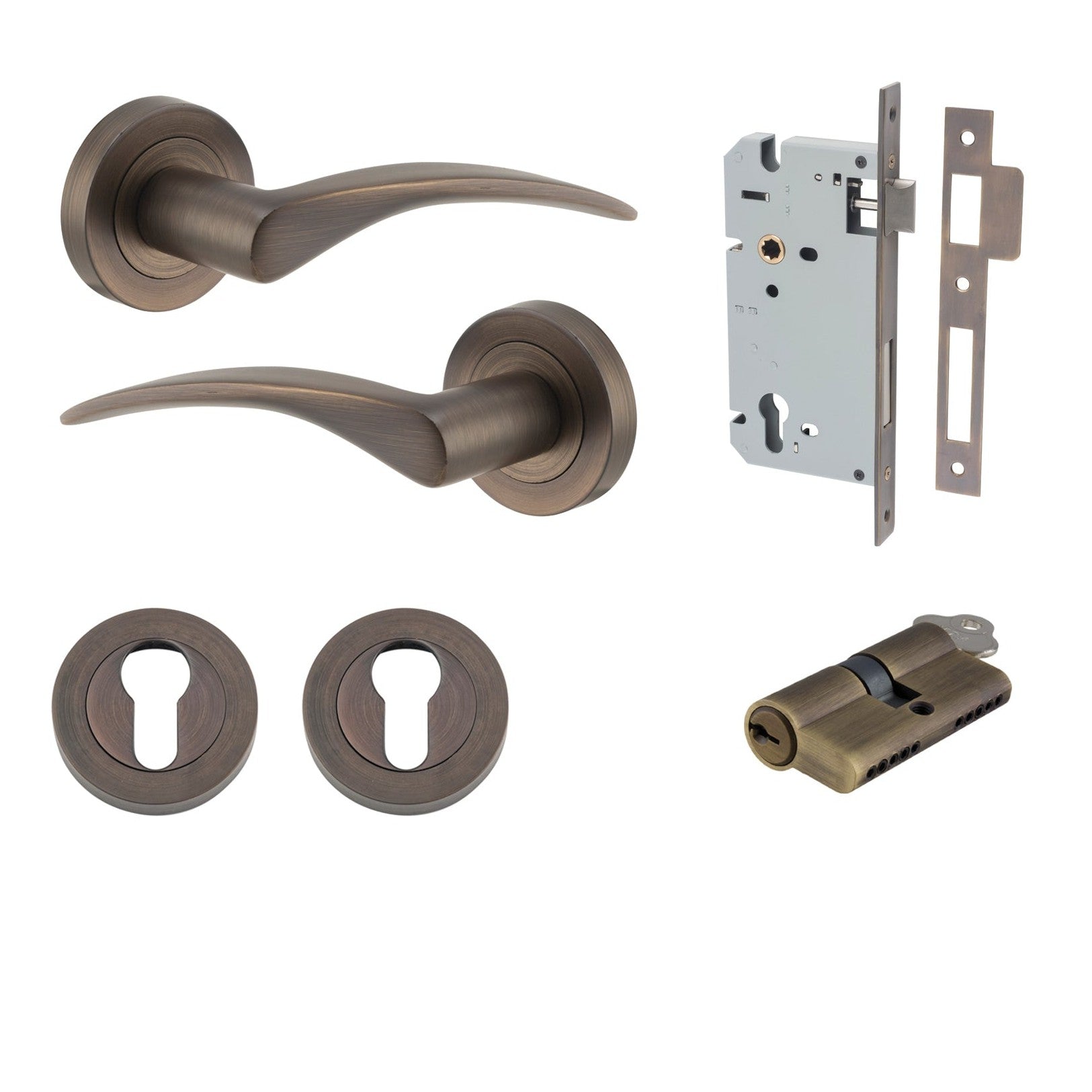 Included in Kit: Door Lever Oxford Round Rose Pair Signature Brass D52xP64mm Entrance Kit, Mortice Lock Euro Signature Brass CTC85mm Backset 60mm, Euro Cylinder Dual Function 5 Pin Polished Brass L65mm KA1, Escutcheon Euro Concealed Fix Round Pair Signature Brass D52xP10mm
