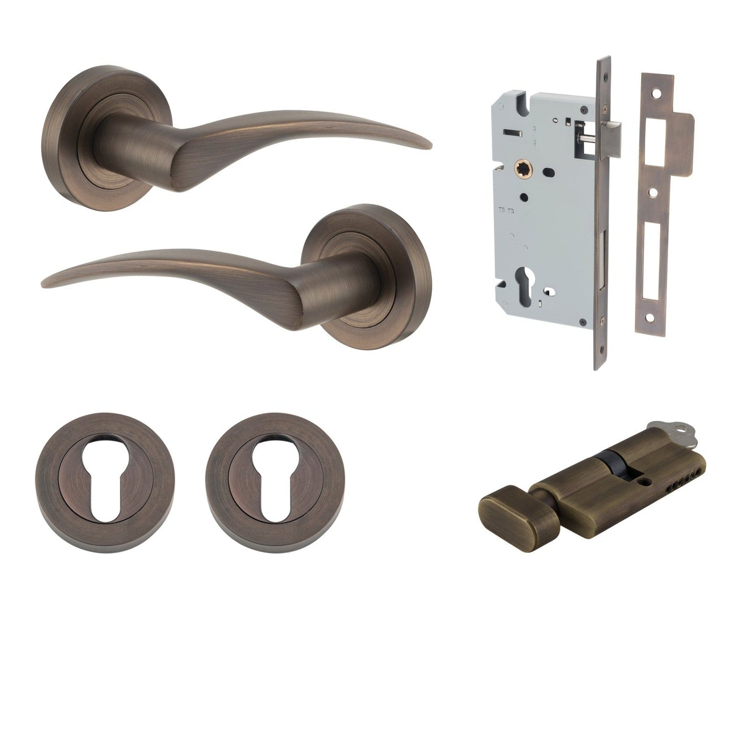 Included in Kit: Door Lever Oxford Round Rose Pair Signature Brass D52xP64mm Entrance Kit, Mortice Lock Euro Signature Brass CTC85mm Backset 60mm, Euro Cylinder Key Thumb 6 Pin Signature Brass L70mm KA1, Escutcheon Euro Concealed Fix Round Pair Signature Brass D52xP10mm