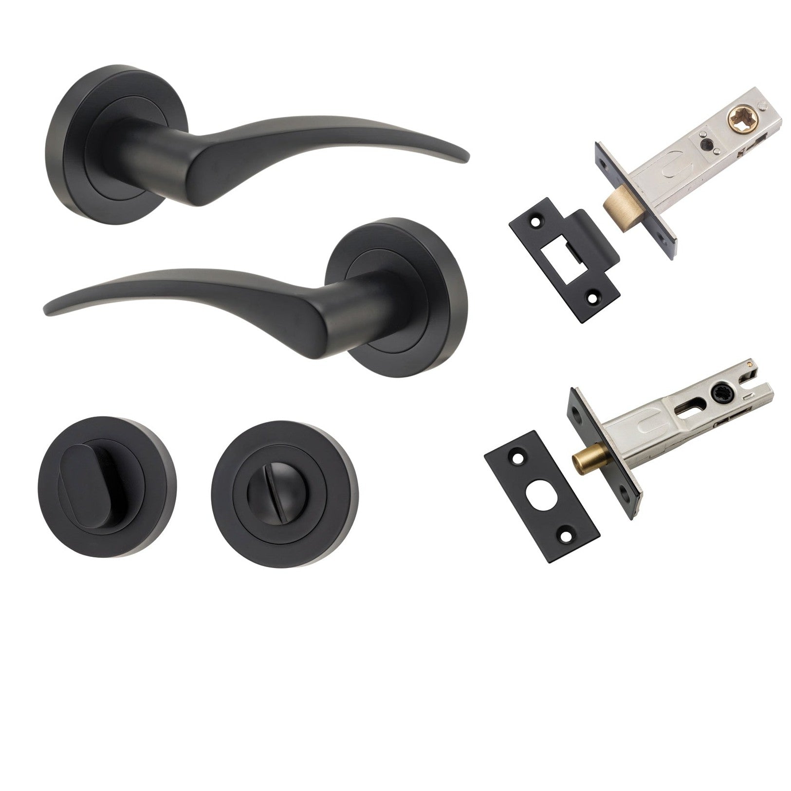 Included in Kit: Door Lever Oxford Round Rose Pair Matt Black D52xP64mm Privacy Kit, Tube Latch Split Cam 'T' Striker Matt Black Backset 60mm, Privacy Bolt Round Bolt Matt Black Backset 60mm, Privacy Turn Oval Concealed Fix Round Matt Black D52xP23mm