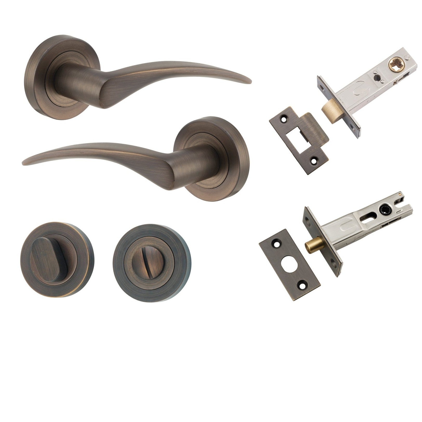 Included in Kit: Door Lever Oxford Round Rose Pair Signature Brass D52xP64mm Privacy Kit, Tube Latch Split Cam 'T' Striker Signature Brass Backset 60mm, Privacy Bolt Round Bolt Signature Brass Backset 60mm, Privacy Turn Oval Concealed Fix Round Signature Brass D52xP23mm