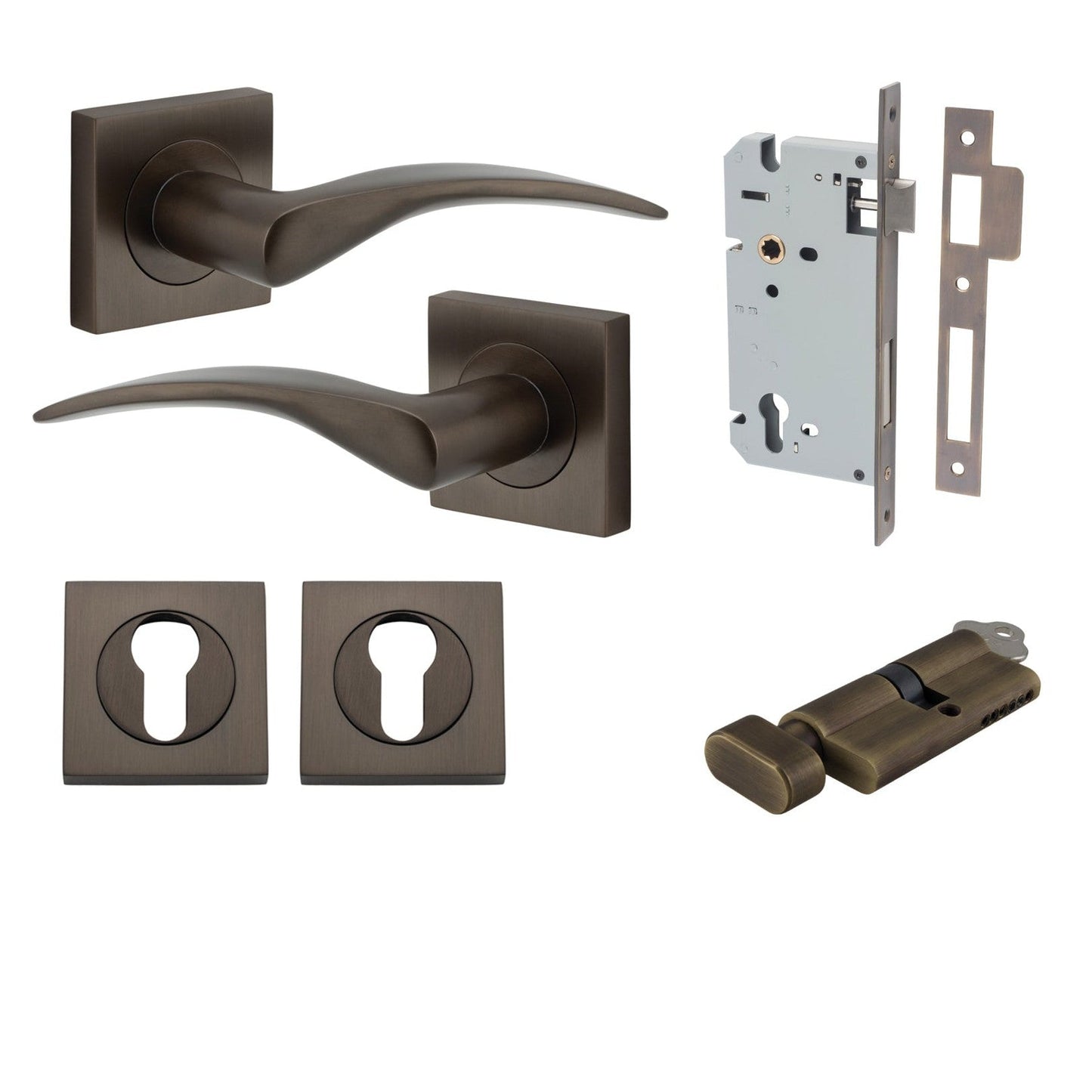 Included in Kit: Door Lever Oxford Square Rose Pair Signature Brass H52xW52xP60mm Entrance Kit, Mortice Lock Euro Signature Brass CTC85mm Backset 60mm, Euro Cylinder Key Thumb 6 Pin Signature Brass L70mm KA1, Escutcheon Euro Concealed Fix Square Pair Signature Brass H52xW52xP10mm