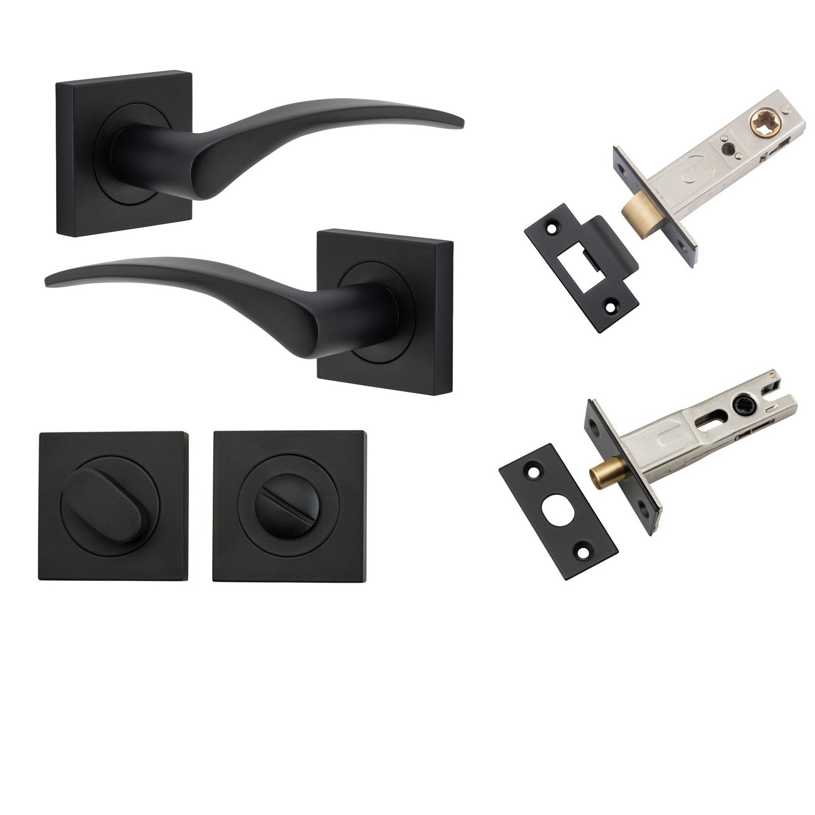 Included in Kit: Door Lever Oxford Square Rose Pair Matt Black H52xW52xP60mm Privacy Kit, Tube Latch Split Cam 'T' Striker Matt Black Backset 60mm, Privacy Bolt Round Bolt Matt Black Backset 60mm, Privacy Turn Oval Concealed Fix Square Matt Black H52xW52xP23mm