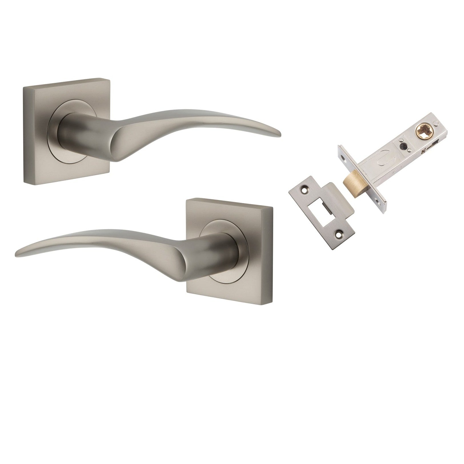 Included in Kit: Door Lever Oxford Square Rose Pair Satin Nickel H52xW52xP60mm Passage Kit, Tube Latch Split Cam 'T' Striker Satin Nickel Backset 60mm