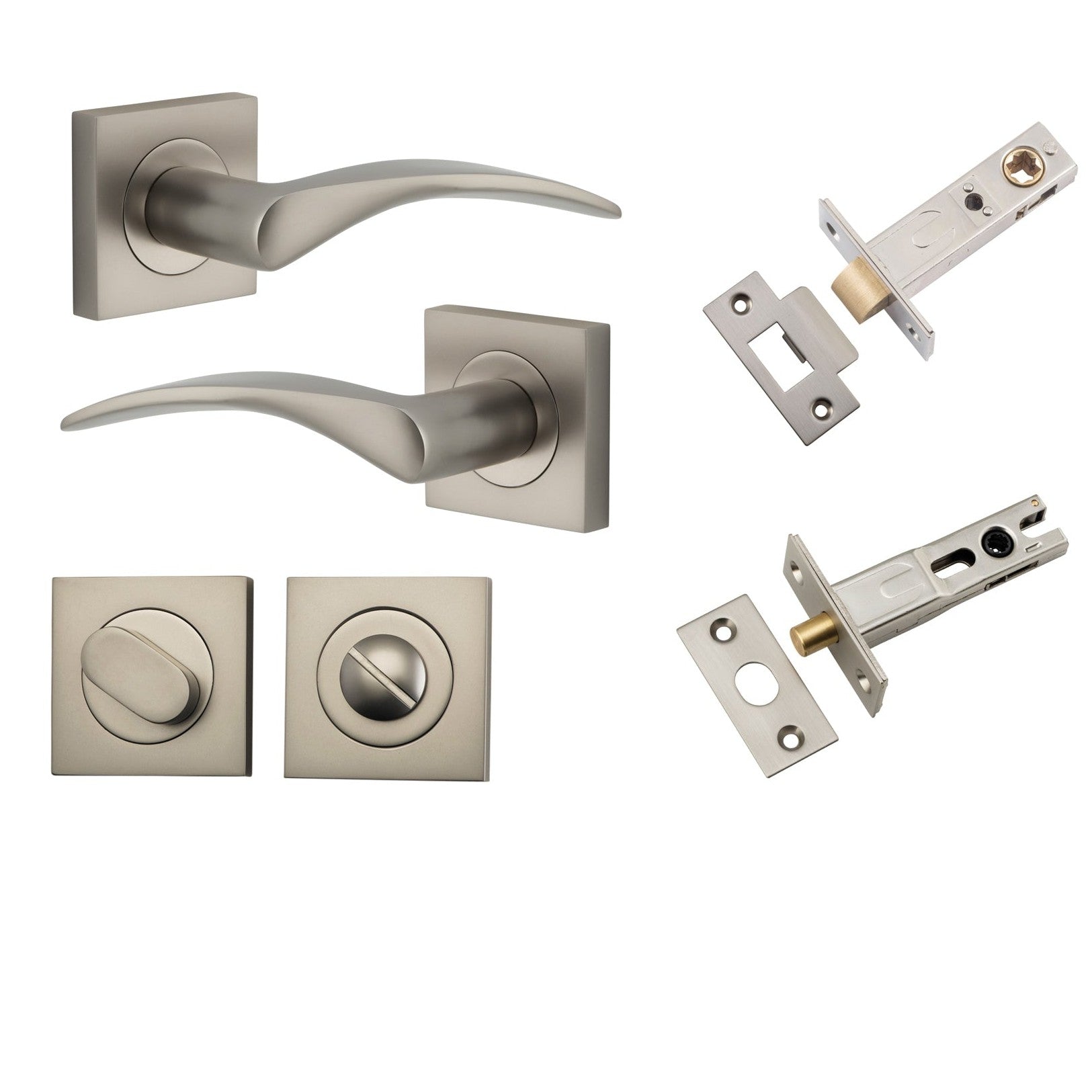Included in Kit: Door Lever Oxford Square Rose Pair Satin Nickel H52xW52xP60mm Privacy Kit, Tube Latch Split Cam 'T' Striker Satin Nickel Backset 60mm, Privacy Bolt Round Bolt Satin Nickel Backset 60mm, Privacy Turn Oval Concealed Fix Square Satin Nickel H52xW52xP23mm