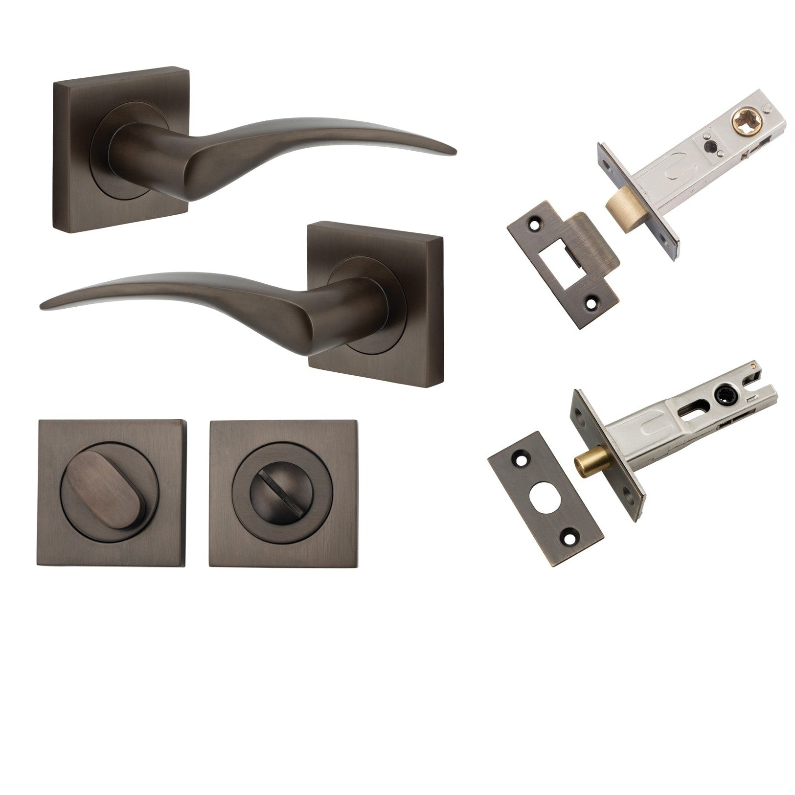 Included in Kit: Door Lever Oxford Square Rose Pair Signature Brass H52xW52xP60mm Privacy Kit, Tube Latch Split Cam 'T' Striker Signature Brass Backset 60mm, Privacy Bolt Round Bolt Signature Brass Backset 60mm, Privacy Turn Oval Concealed Fix Square Signature Brass H52xW52xP23mm
