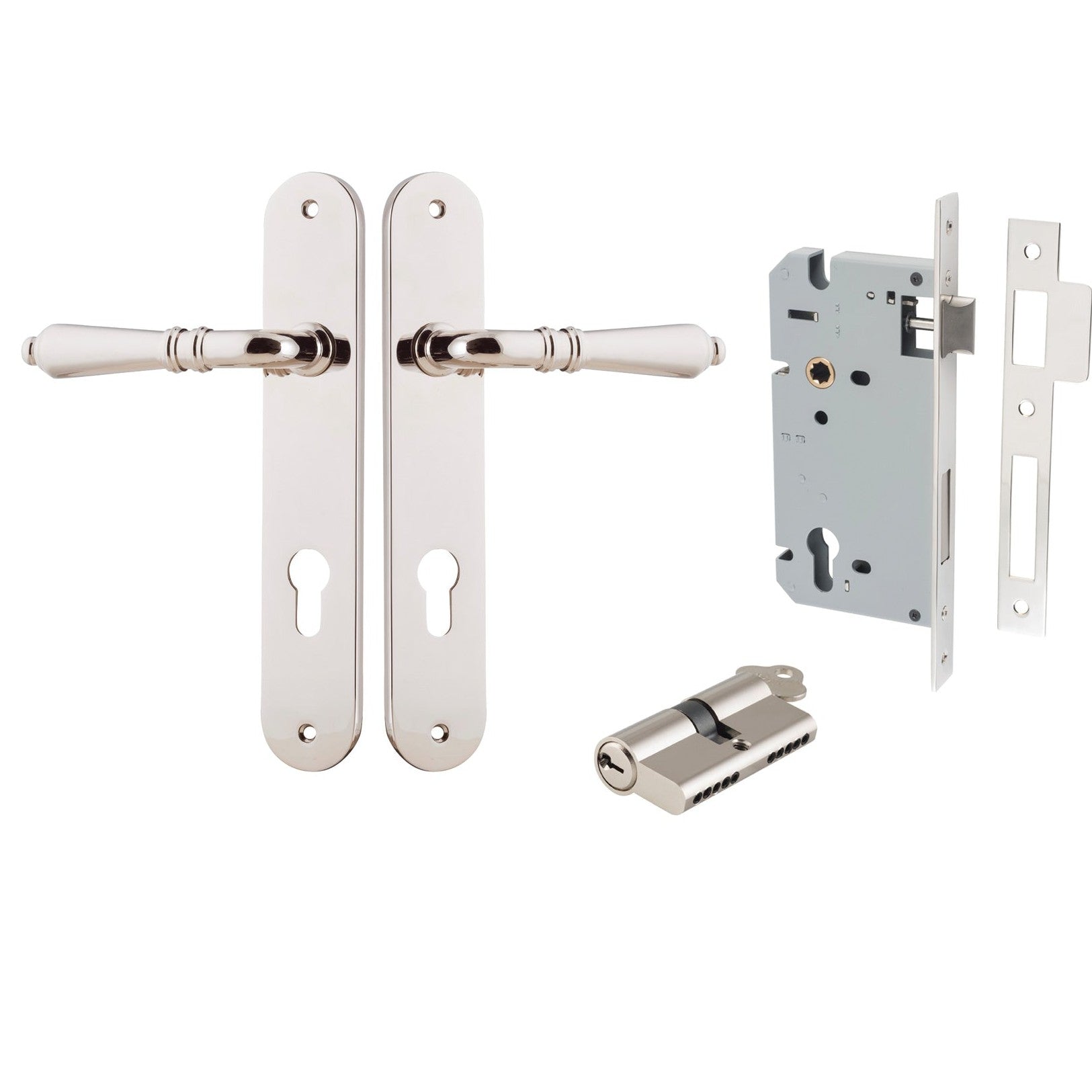 Included in Kit: Door Lever Sarlat Oval Euro Polished Nickel CTC85mm H240xW40xP55mm Entrance Kit, Mortice Lock Euro Polished Nickel CTC85mm Backset 60mm, Euro Cylinder Dual Function 5 Pin Polished Nickel L65mm KA1