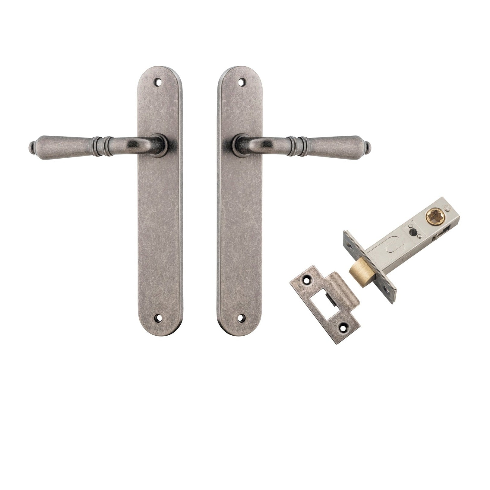 Included in Kit: Door Lever Sarlat Oval Latch Distressed Nickel H240xW40xP55mm Passage Kit, Tube Latch Split Cam 'T' Striker Distressed Nickel Backset 60mm