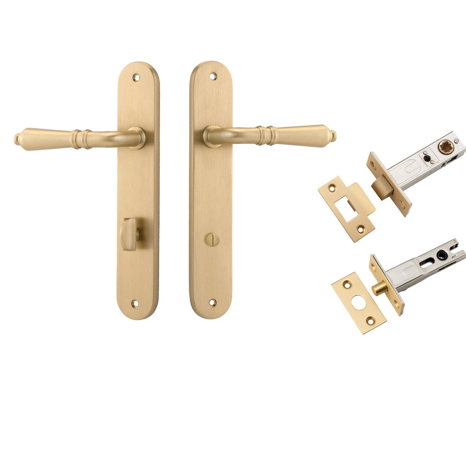 Included in Kit: Door Lever Sarlat Oval Privacy Brushed Brass CTC85mm H240xW40xP55mm Inbuilt Privacy Kit, Tube Latch Split Cam 'T' Striker Brushed Brass Backset 60mm, Privacy Bolt Round Bolt Brushed Brass Backset 60mm