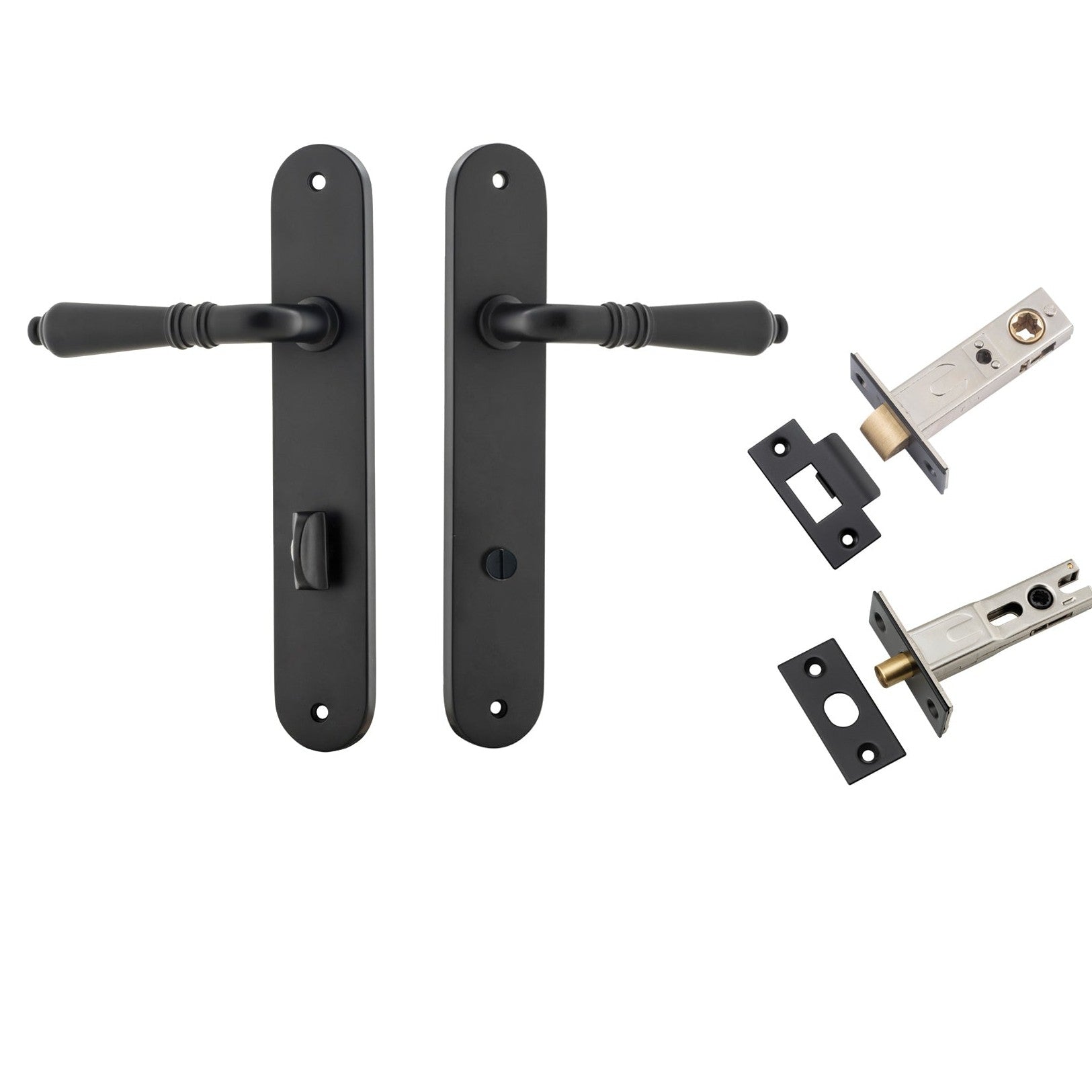 Included in Kit: Door Lever Sarlat Oval Privacy Matt Black CTC85mm H240xW40xP55mm Inbuilt Privacy Kit, Tube Latch Split Cam 'T' Striker Matt Black Backset 60mm, Privacy Bolt Round Bolt Matt Black Backset 60mm