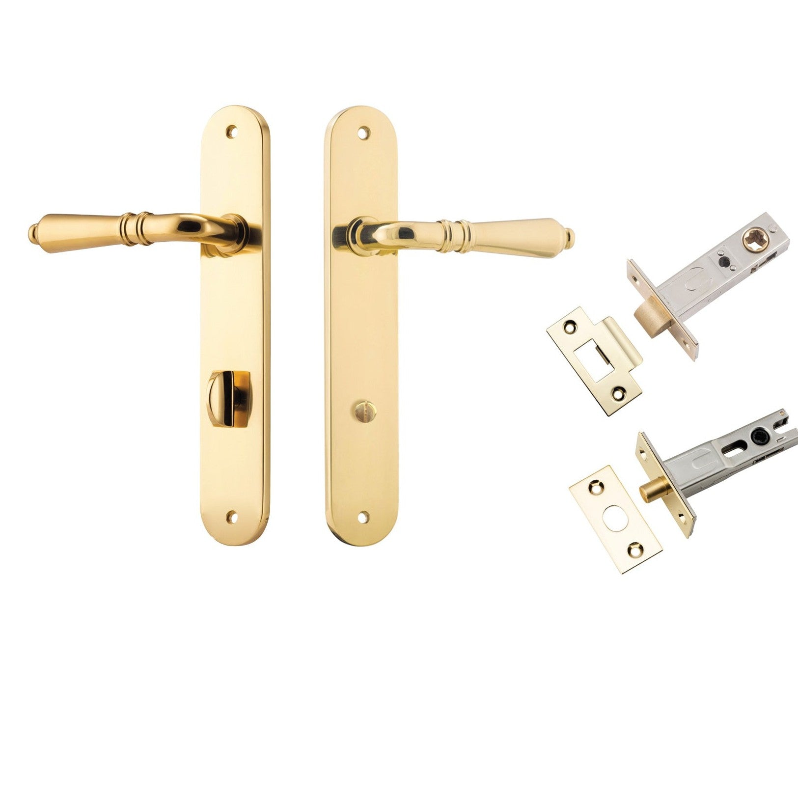 Included in Kit: Door Lever Sarlat Oval Privacy Polished Brass CTC85mm H240xW40xP55mm Inbuilt Privacy Kit, Tube Latch Split Cam 'T' Striker Polished Brass Backset 60mm, Privacy Bolt Round Bolt Polished Brass Backset 60mm