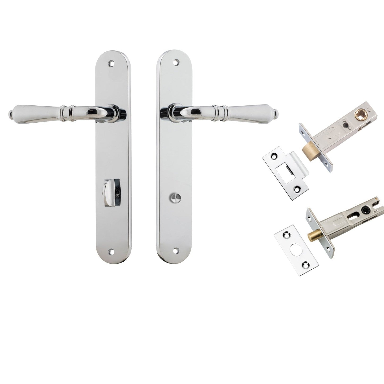 Included in Kit: Door Lever Sarlat Oval Privacy Polished Chrome CTC85mm H240xW40xP55mm Inbuilt Privacy Kit, Tube Latch Split Cam 'T' Striker Polished Chrome Backset 60mm, Privacy Bolt Round Bolt Polished Chrome Backset 60mm