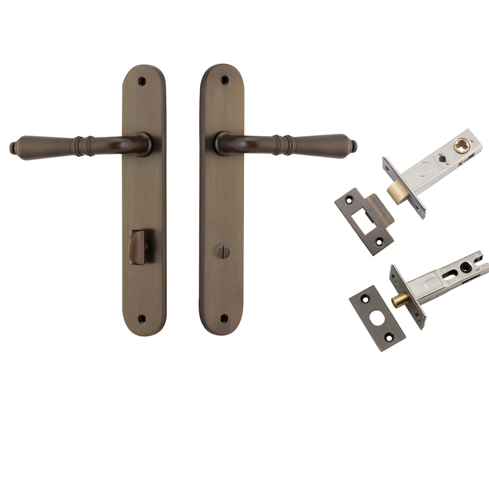 Included in Kit: Door Lever Sarlat Oval Privacy Signature Brass CTC85mm H240xW40xP55mm Inbuilt Privacy Kit, Tube Latch Split Cam 'T' Striker Signature Brass Backset 60mm, Privacy Bolt Round Bolt Signature Brass Backset 60mm