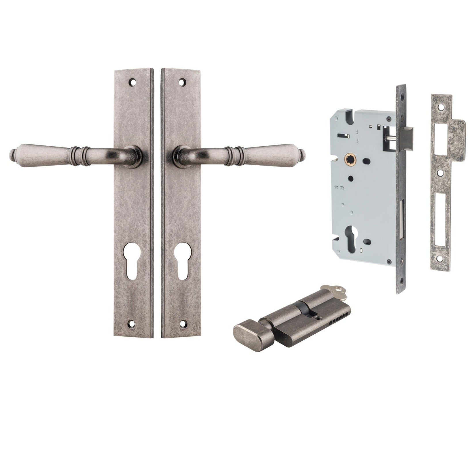 Included in Kit: Door Lever Sarlat Rectangular Euro Distressed Nickel CTC85mm H240xW38xP55mm Entrance Kit, Mortice Lock Euro Distressed Nickel CTC85mm Backset 60mm, Euro Cylinder Key Thumb 6 Pin Distressed Nickel L70mm KA1