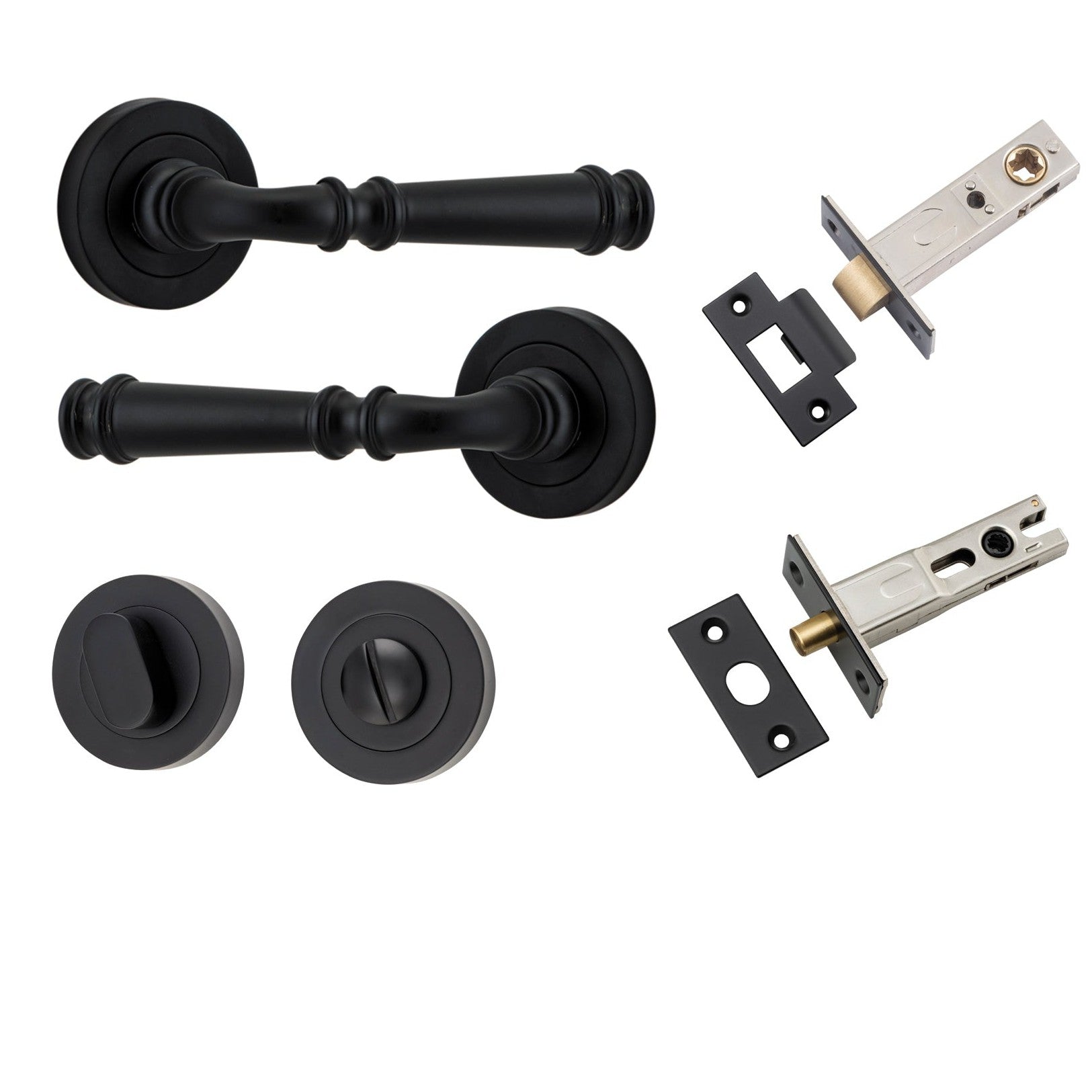 Included in Kit: Door Lever Verona Round Rose Pair Matt Black D52xP59mm Privacy Kit, Tube Latch Split Cam 'T' Striker Matt Black Backset 60mm, Privacy Bolt Round Bolt Matt Black Backset 60mm, Privacy Turn Oval Concealed Fix Round Matt Black D52xP23mm