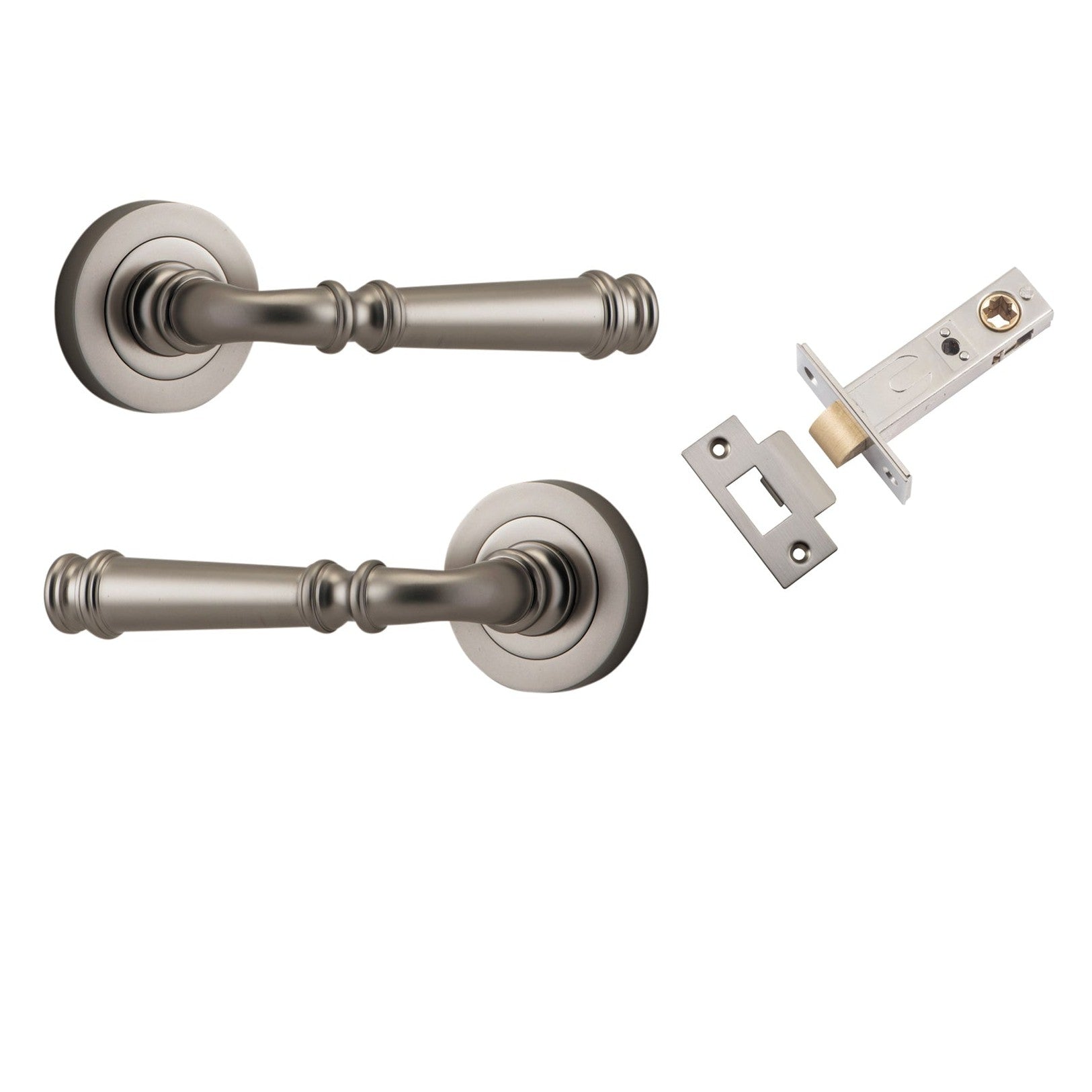 Included in Kit: Door Lever Verona Round Rose Pair Satin Nickel D52xP59mm Passage Kit, Tube Latch Split Cam 'T' Striker Satin Nickel Backset 60mm