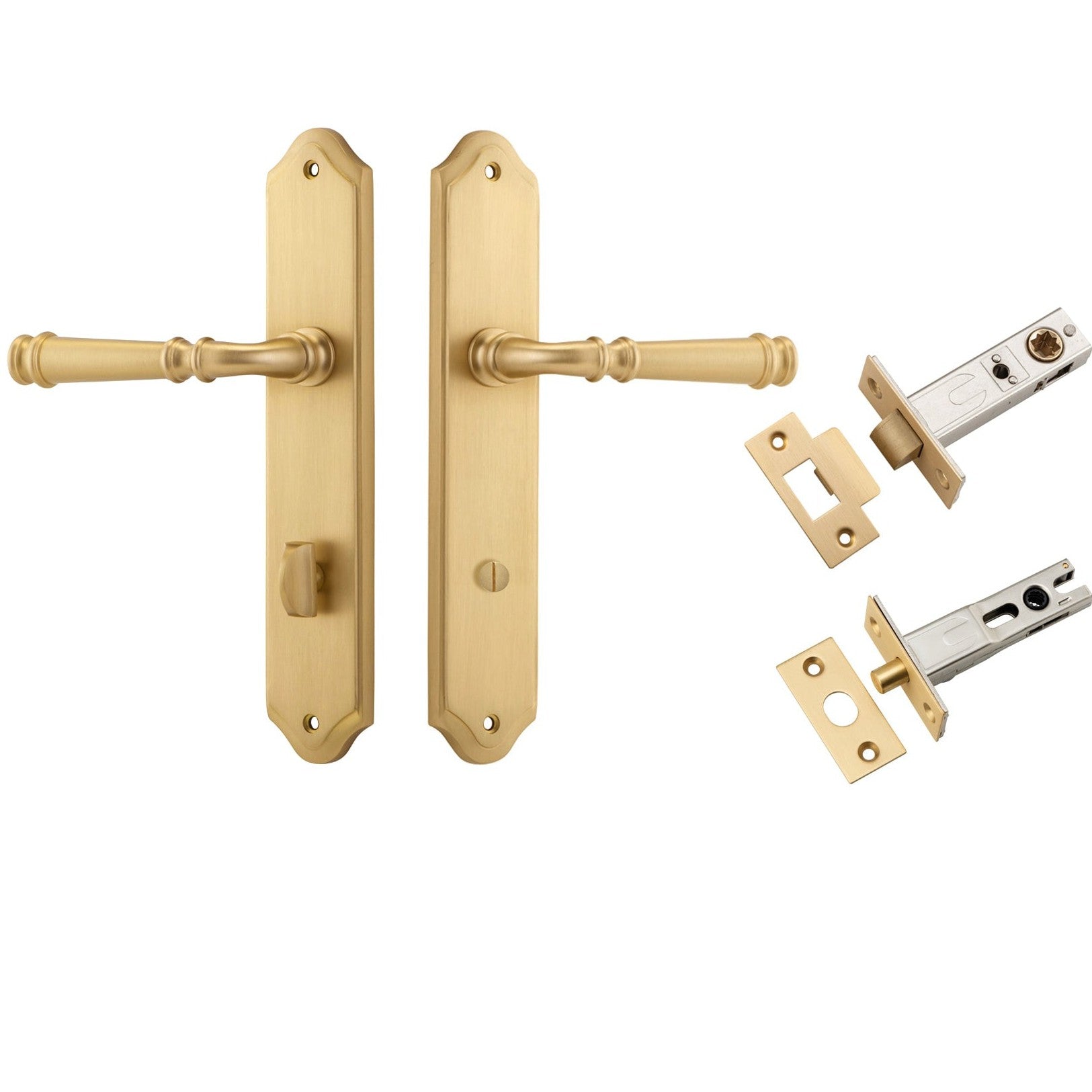 Included in Kit: Door Lever Verona Shouldered Privacy Brushed Brass CTC85mm H240xW50xP59mm Inbuilt Privacy Kit, Tube Latch Split Cam 'T' Striker Brushed Brass Backset 60mm, Privacy Bolt Round Bolt Brushed Brass Backset 60mm