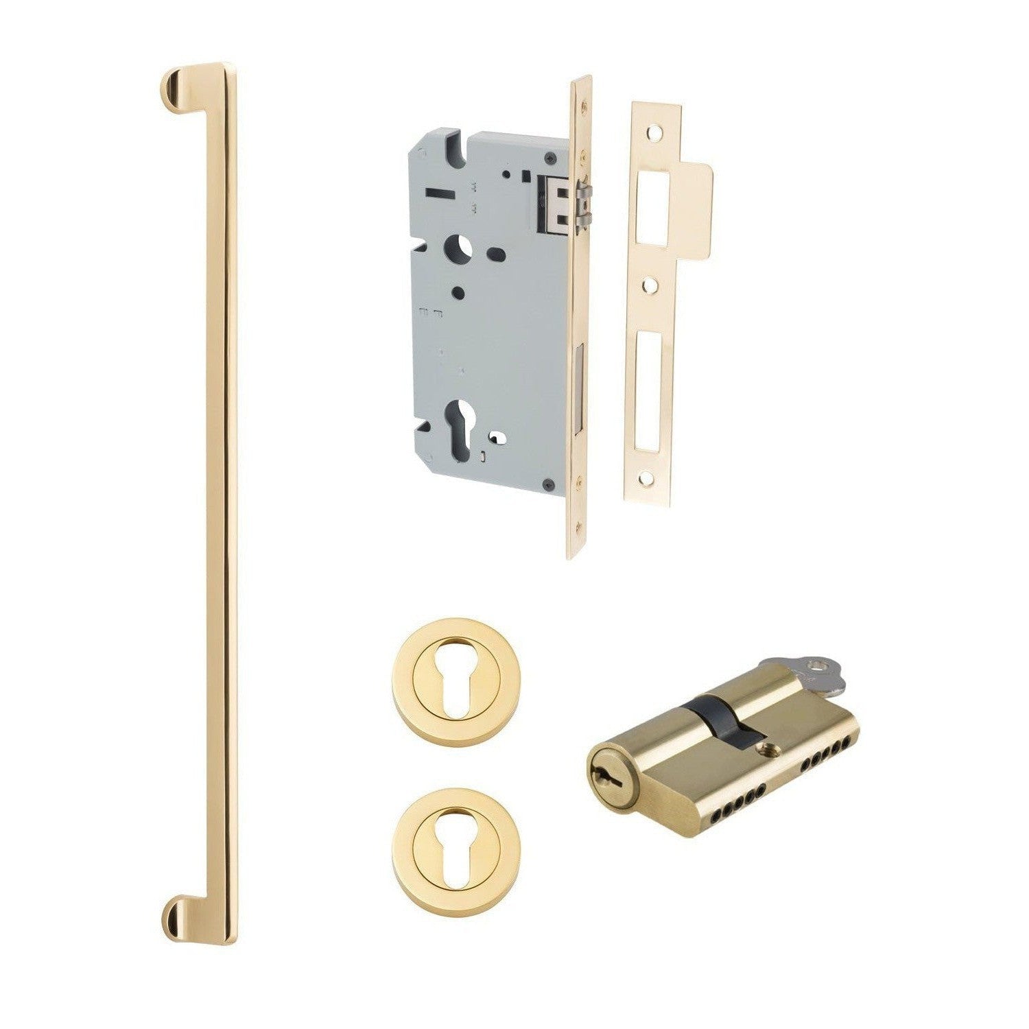 Included in Kit: Pull Handle Baltimore Polished Brass L635xW13xP64mm BP35mm CTC600mm Entrance Kit, Mortice Lock Roller Euro Polished Brass CTC85mm Backset 60mm, Euro Cylinder Dual Function 5 Pin Polished Brass L65mm KA1, Escutcheon Euro Concealed Fix Round Pair Polished Brass D52xP10mm