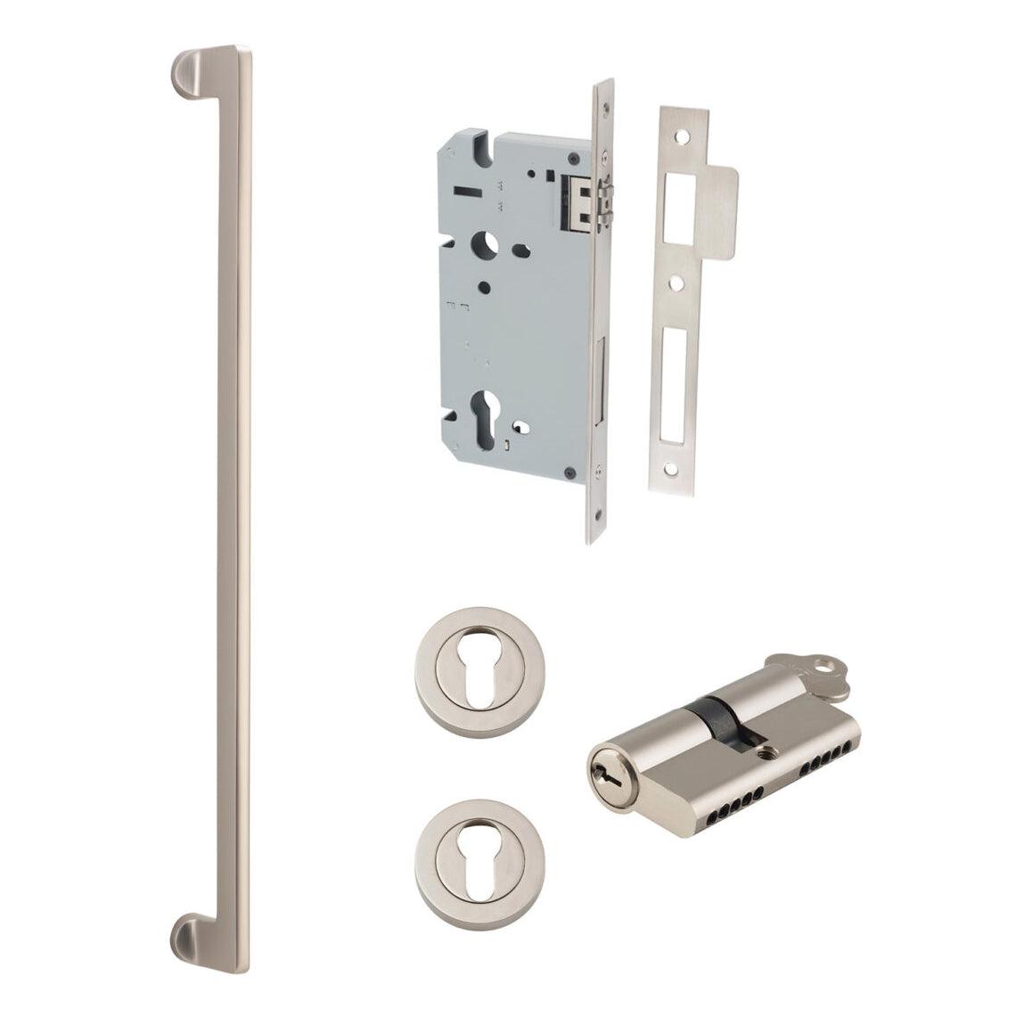 Included in Kit: Pull Handle Baltimore Satin Nickel L635xW13xP64mm BP35mm CTC600mm Entrance Kit, Mortice Lock Roller Euro Satin Nickel CTC85mm Backset 60mm, Euro Cylinder Dual Function 5 Pin Satin Nickel L65mm KA1, Escutcheon Euro Concealed Fix Round Pair Satin Nickel D52xP10mm